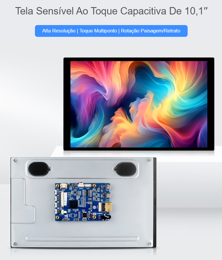 O Waveshare 10.1EP-CAPLCD (SKU 28882) é um ecrã tátil capacitivo de 10,1’’ com resolução 1920×1200, pensado para interfaces gráficas em SBCs (ex.: Raspberry Pi/Jetson), mini PCs e computadores. Combina painel IPS (178°) com laminação ótica (optical bonding) e vidro endurecido, para uma imagem nítida e maior robustez.