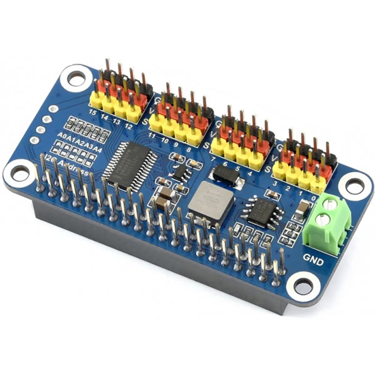 Placa de expansão concebida para computadores da família Raspberry Pi, destinada ao controlo preciso e estável de múltiplos servomotores PWM. Baseado num controlador PWM dedicado de 16 canais, o módulo permite gerar sinais PWM com elevada resolução e frequência estável, independentemente da carga de processamento do Raspberry Pi. A comunicação é realizada através de interface I²C, o que reduz significativamente a utilização de pinos GPIO e permite a ligação de múltiplas placas no mesmo barramento, através da configuração de endereços I²C distintos.