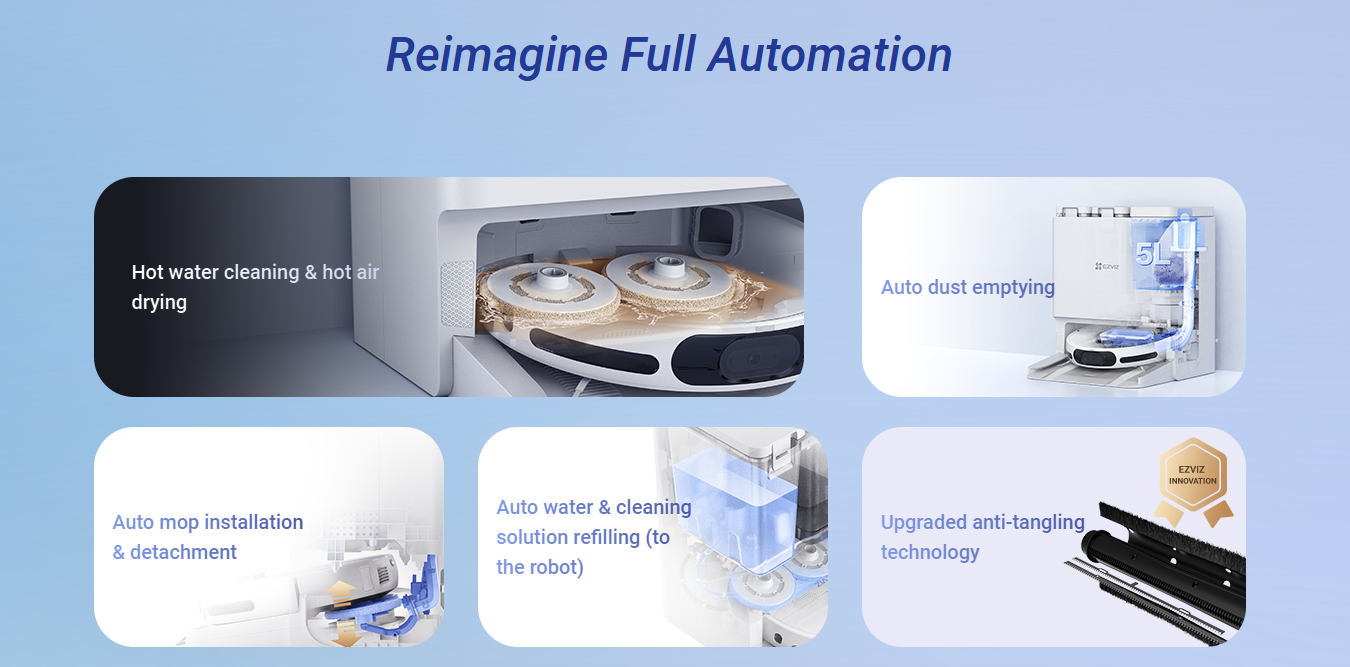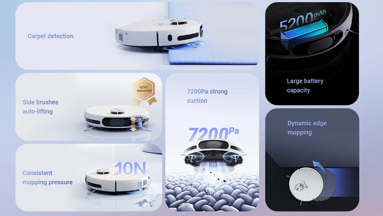 O EZVIZ RS20 Pro representa o auge da limpeza automatizada, combinando tecnologias de inteligência artificial com uma potência de aspiração de 7200 Pa. Este sistema inteligente adapta-se dinamicamente a diferentes superfícies, sendo capaz de instalar e remover as suas próprias mopas giratórias de forma autónoma para proteger tapetes e otimizar a higiene.