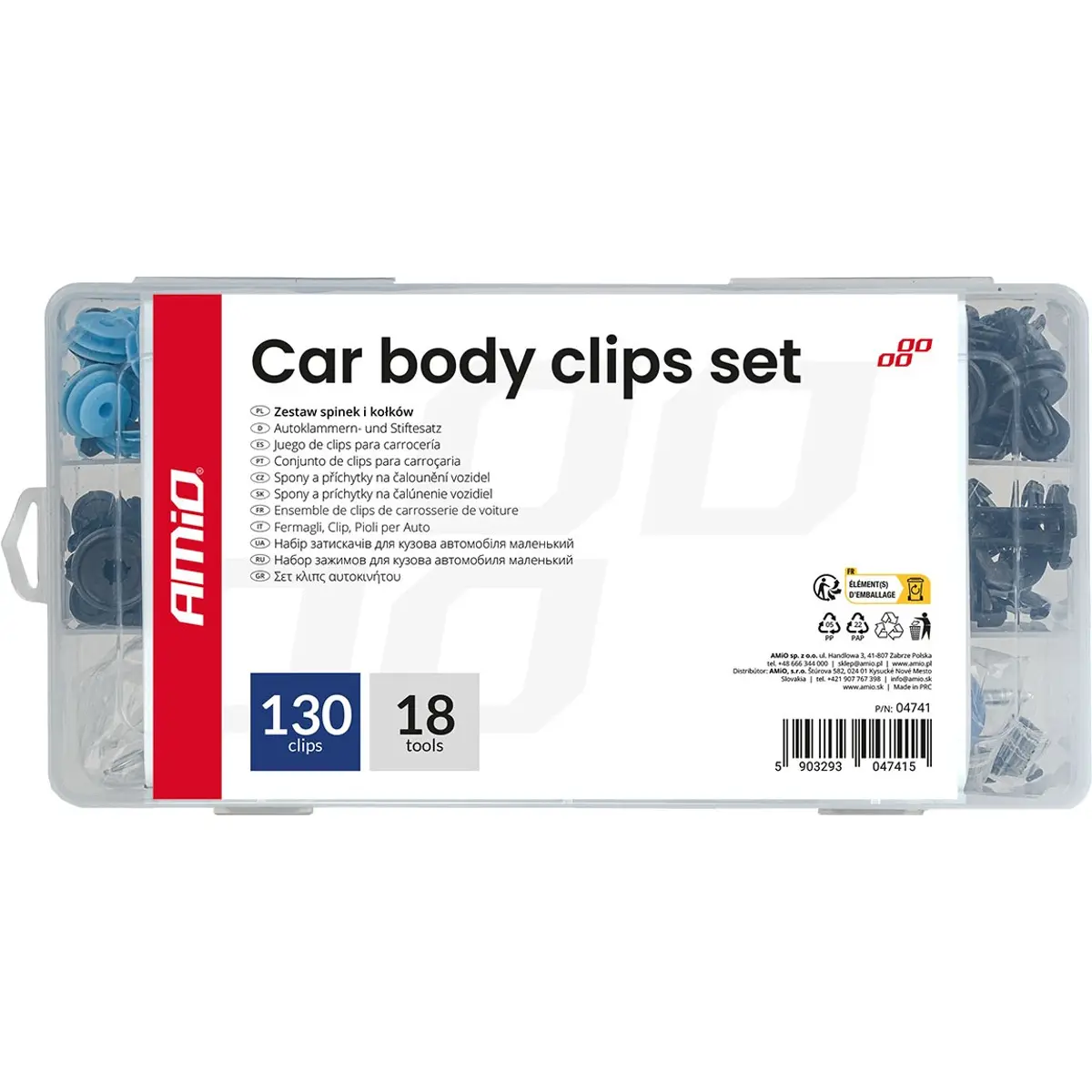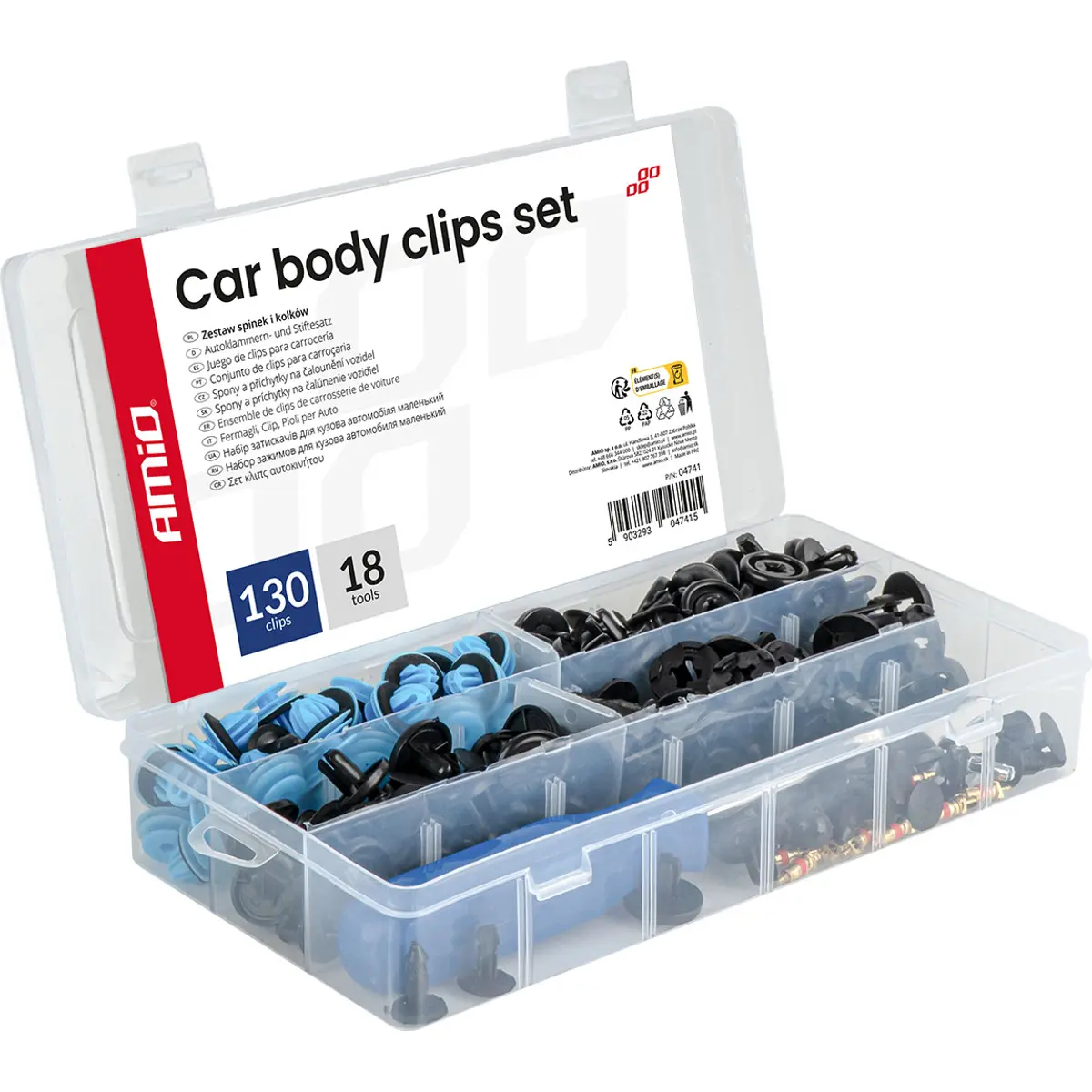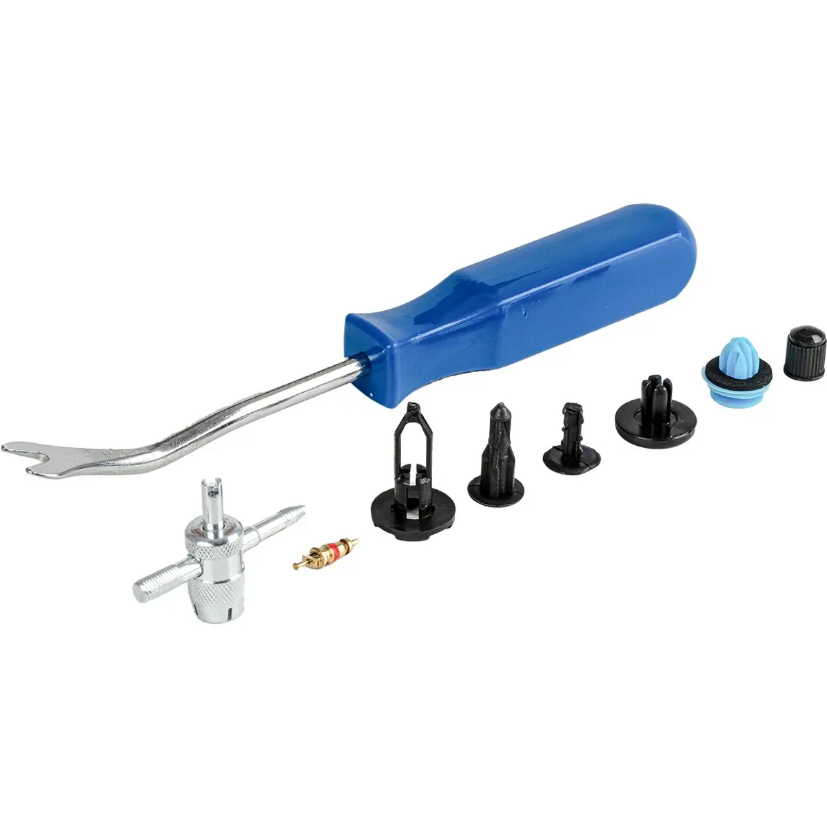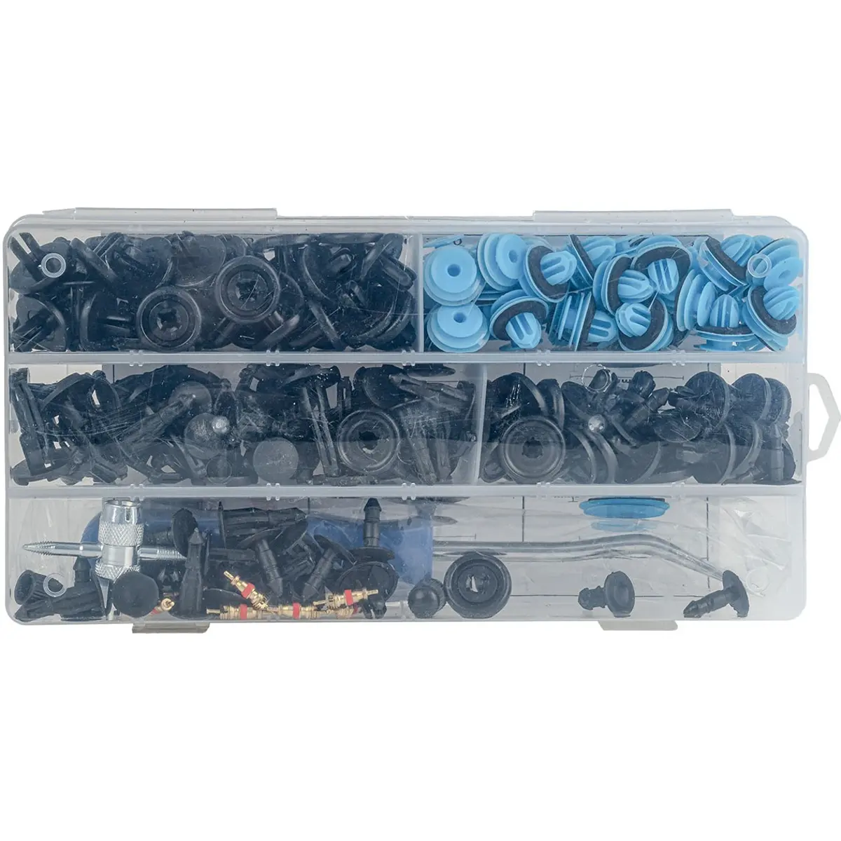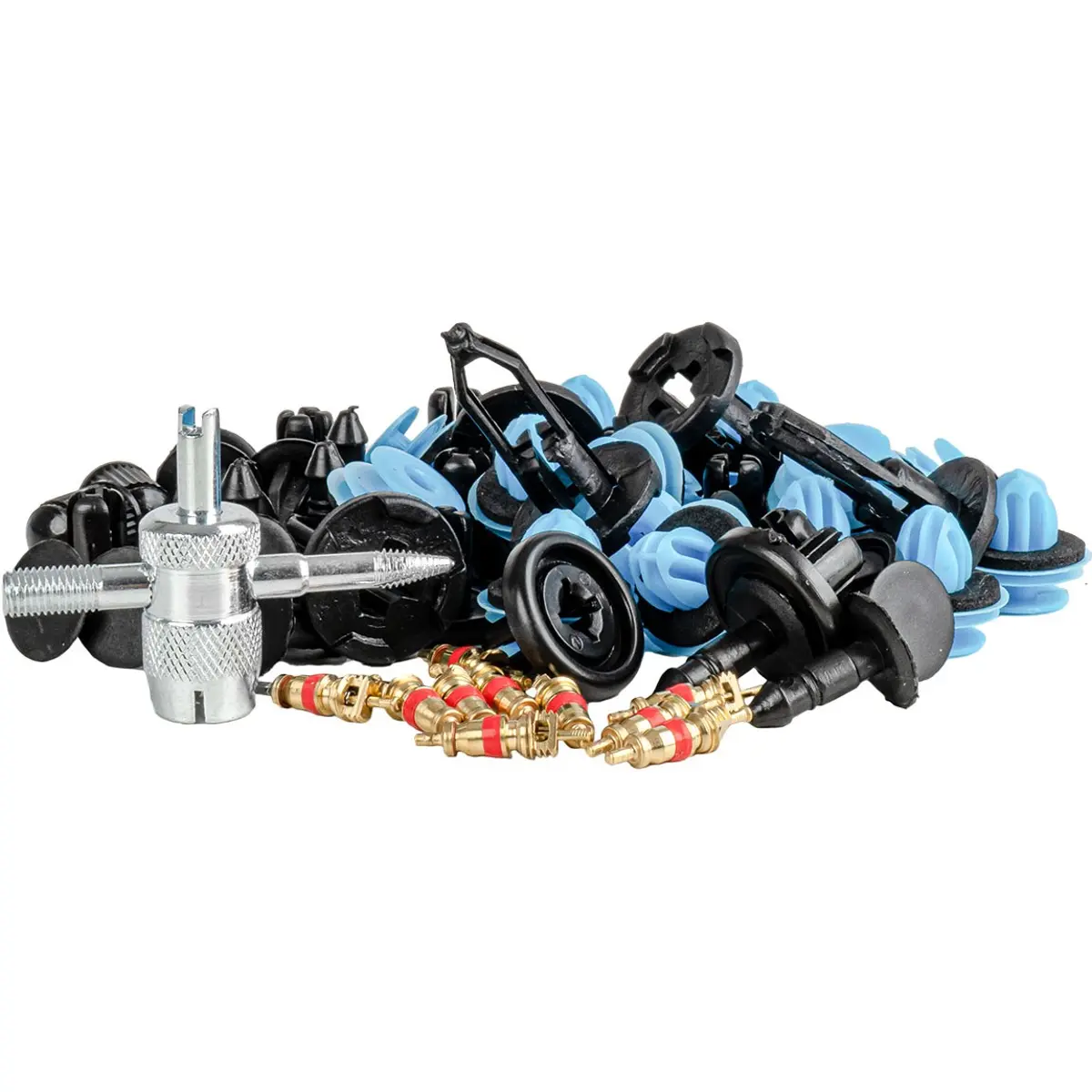 Kit multifunções de fixação automóvel que combina clips de carroçaria, ferramenta de remoção e núcleos de válvula de ar, numa solução prática para manutenção geral de veículos. As peças podem ser utilizados para fixação de painéis de porta, forros interiores, pára-choques, cavas de roda, etc., e as válvulas em pneus e sistemas de ar condicionado. Este conjunto é indicado tanto para oficinas como para utilizadores que realizam manutenção automóvel por conta própria.