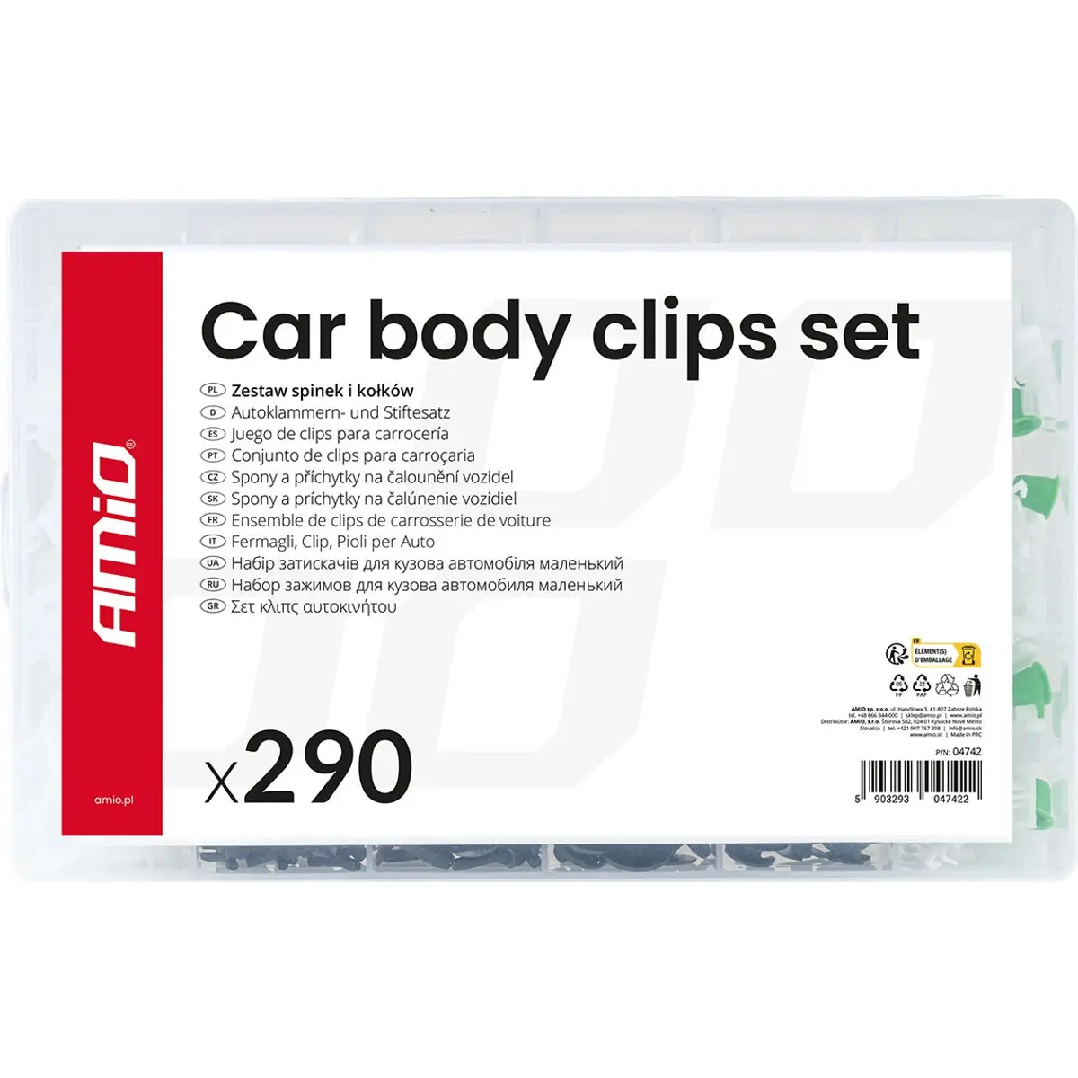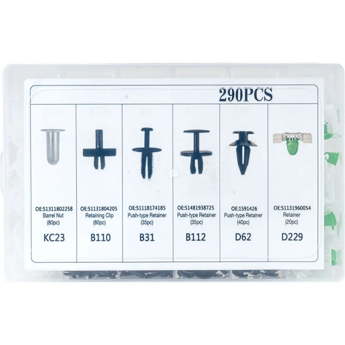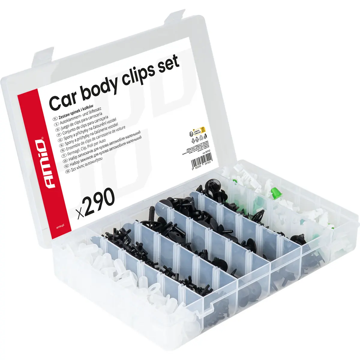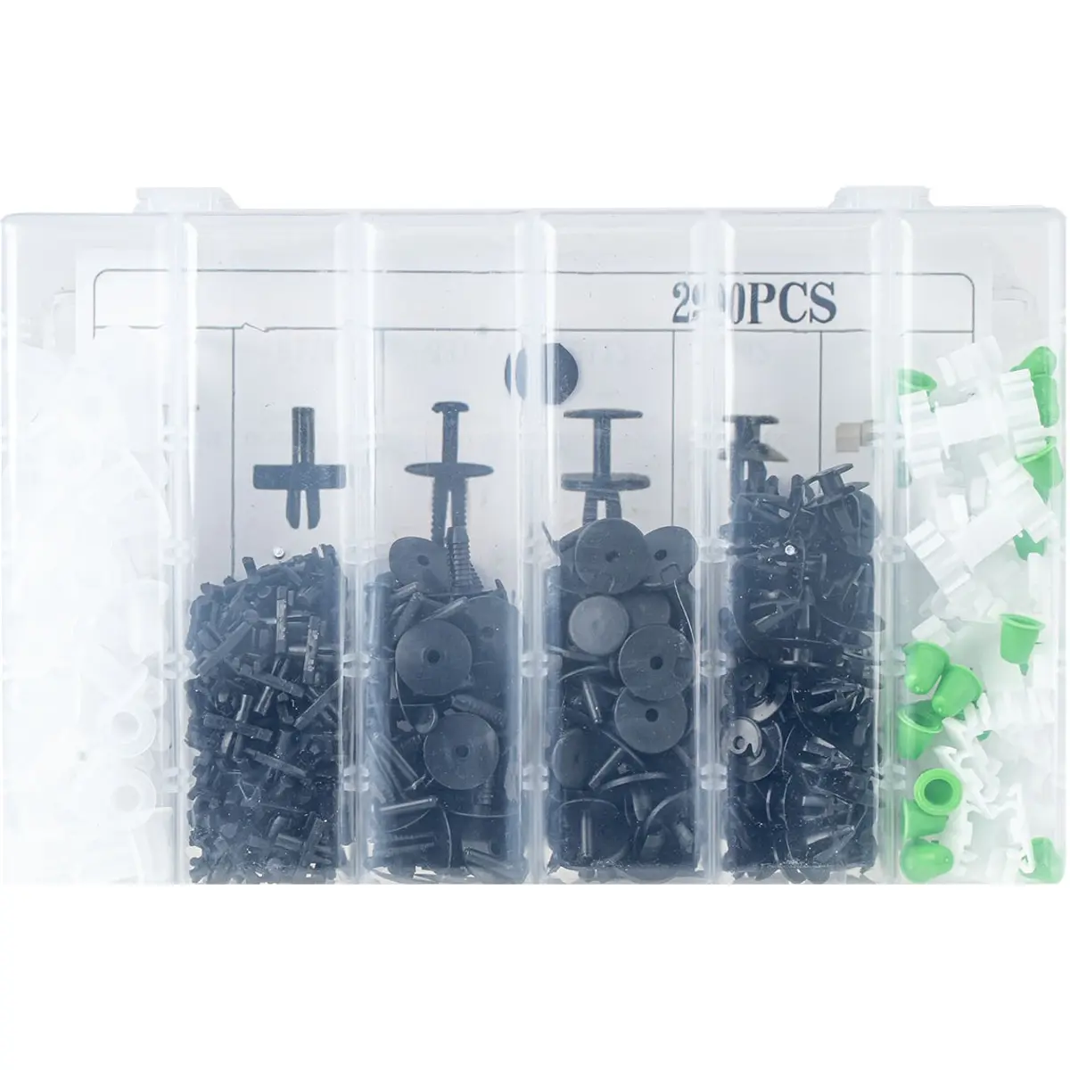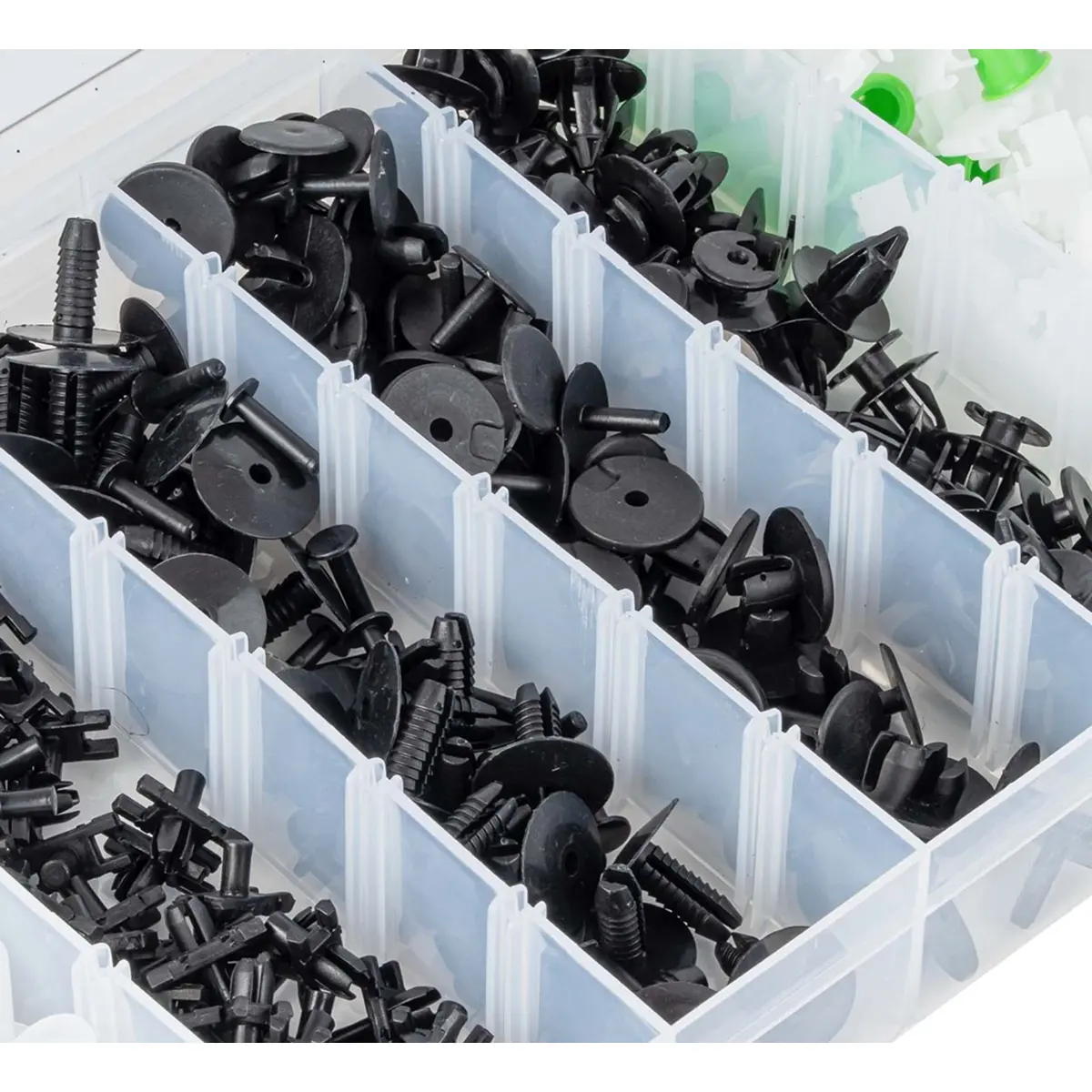 Conjunto de 290 molas, rebites e pinos de fixação, para painéis, resguardos, molduras, capas plásticas e outras peças da carroçaria. Estes componentes são feitos de plástico durável, para resistir a deformações, condições metereológicas adversas e uso exigente. Componentes essenciais em qualquer oficina auto ou para entusiastas do DIY no ramo automóvel.