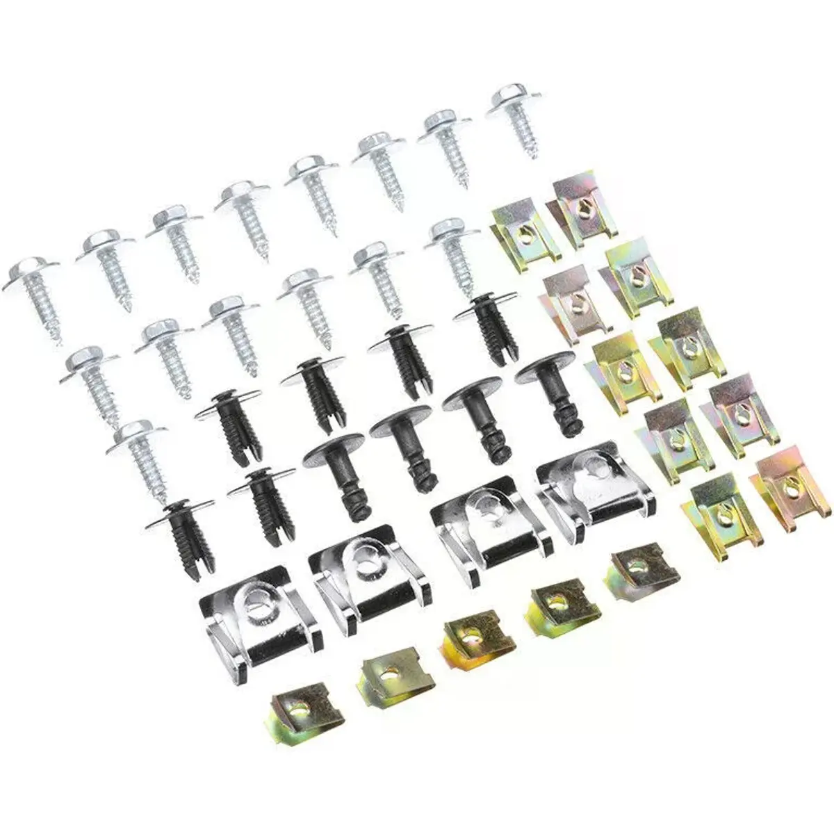 Conjunto universal de clips metálicos em formato U com parafusos de fixação, concebido para aplicações automóveis onde seja necessária uma fixação segura e durável de painéis, revestimentos plásticos e acabamentos. A variedade de clips incluídos permite intervenções de manutenção, reparação ou substituição em diferentes pontos do veículo, garantindo compatibilidade com vários sistemas de fixação utilizados na indústria automóvel.