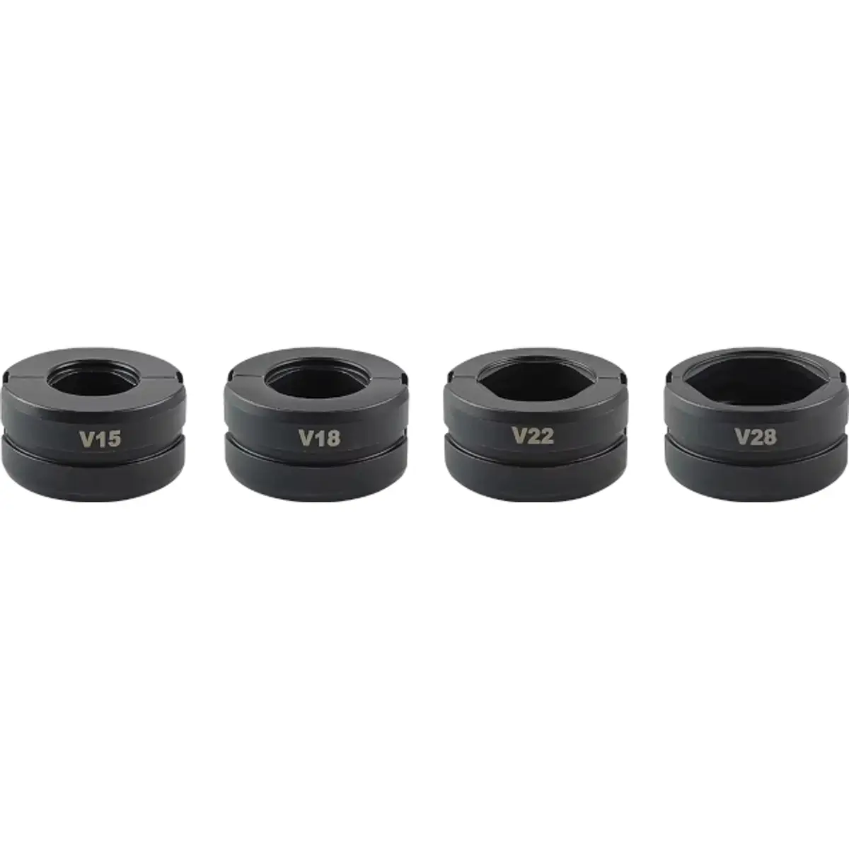 Conjunto de matrizes de cravação tipo V concebidas para utilização em prensas hidráulicas. Permitem realizar cravações precisas e seguras em diferentes diâmetros de tubos e conexões.