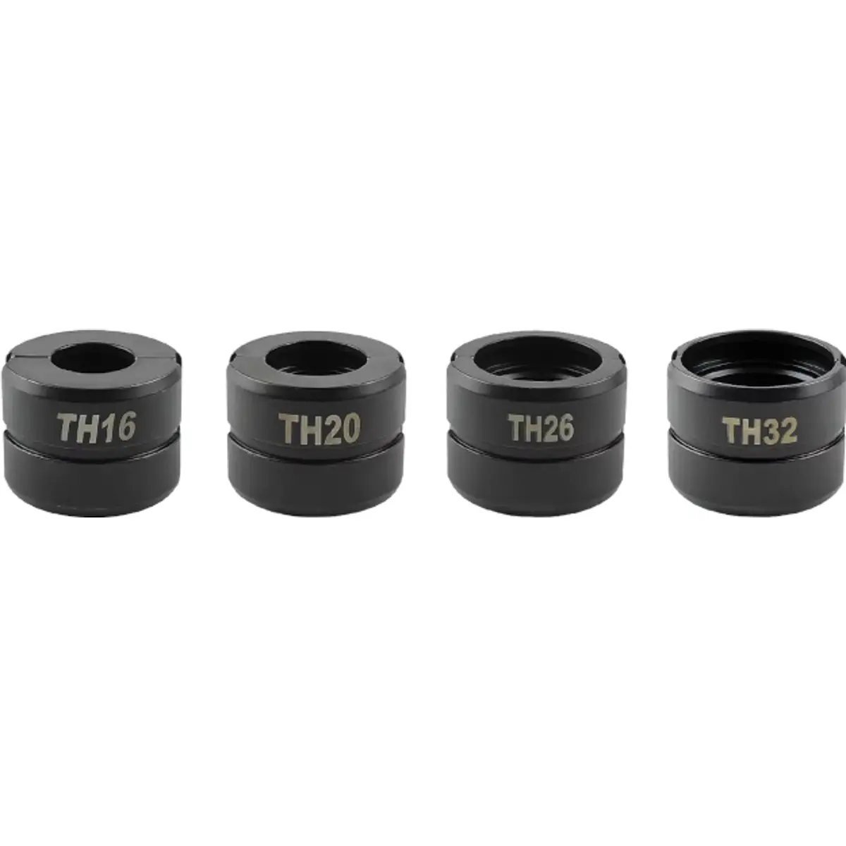 Conjunto de matrizes de cravação tipo TH concebidas para utilização em prensas hidráulicas. Permitem realizar cravações precisas e seguras em diferentes diâmetros de tubos e conexões.