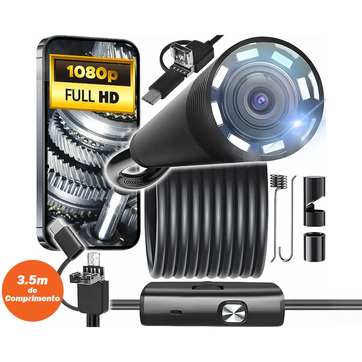 Ideal para inspeções em locais de difícil acesso, esta câmara endoscópica combina imagem Full HD 1920×1080 com um cabo semi-rígido de 3.5m para facilitar a orientação em condutas, tubagens e cavidades. Inclui iluminação LED ajustável e ligações 3-em-1, permitindo utilização em smartphone/tablet (Android com USB OTG) ou diretamente num laptop para visualização num ecrã maior.