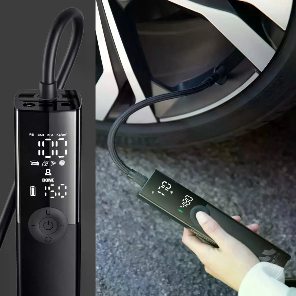 Equipado com uma bateria de 4800mAh e carregamento USB-C, este dispositivo compacto oferece modos predefinidos para carros, motas, bicicletas e bolas, facilitando o enchimento preciso e automático.
