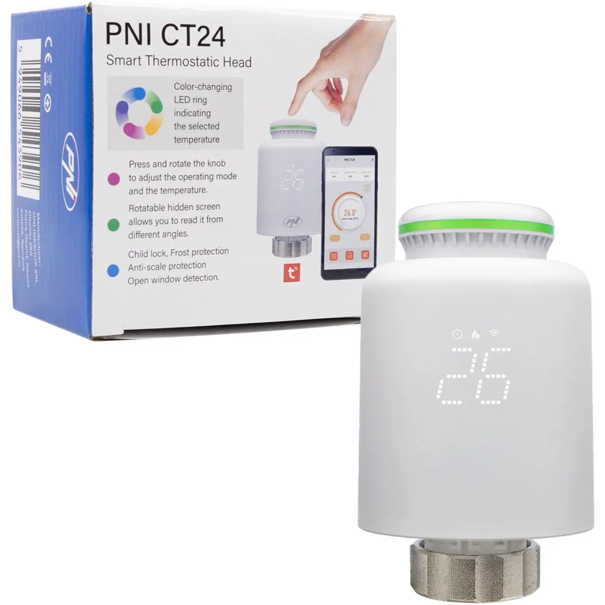 A válvula termostática inteligente PNI CT24 é um dispositivo concebido para controlo individual da temperatura em radiadores, permitindo melhorar o conforto térmico e otimizar o consumo energético em habitações ou escritórios. Este equipamento mede a temperatura ambiente e ajusta automaticamente o fluxo de água no radiador, mantendo o nível de aquecimento definido. A instalação é feita diretamente na válvula do radiador, sendo compatível com vários sistemas graças ao conjunto de adaptadores incluído.