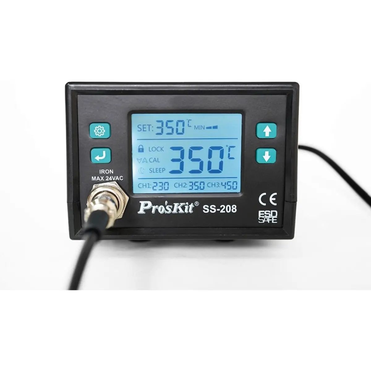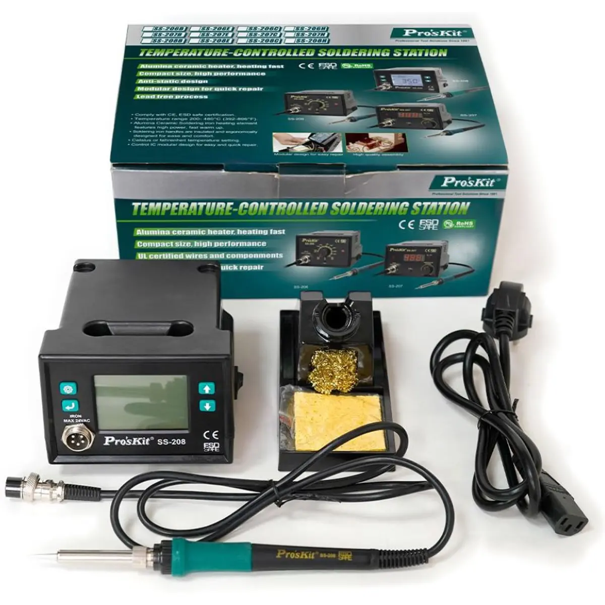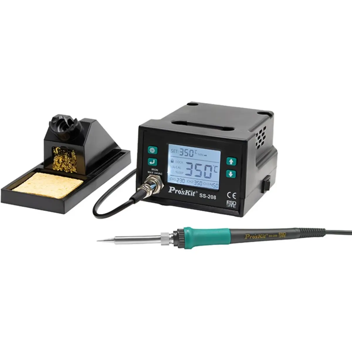 A estação de soldar Proskit SS-208B é uma solução avançada e fiável para trabalhos de eletrónica que exigem precisão e controlo rigoroso de temperatura. Equipada com controlo digital por CPU e ecrã LCD retroiluminado, oferece aquecimento rápido, estabilidade térmica e funcionalidades inteligentes que aumentam a eficiência e a segurança no trabalho.