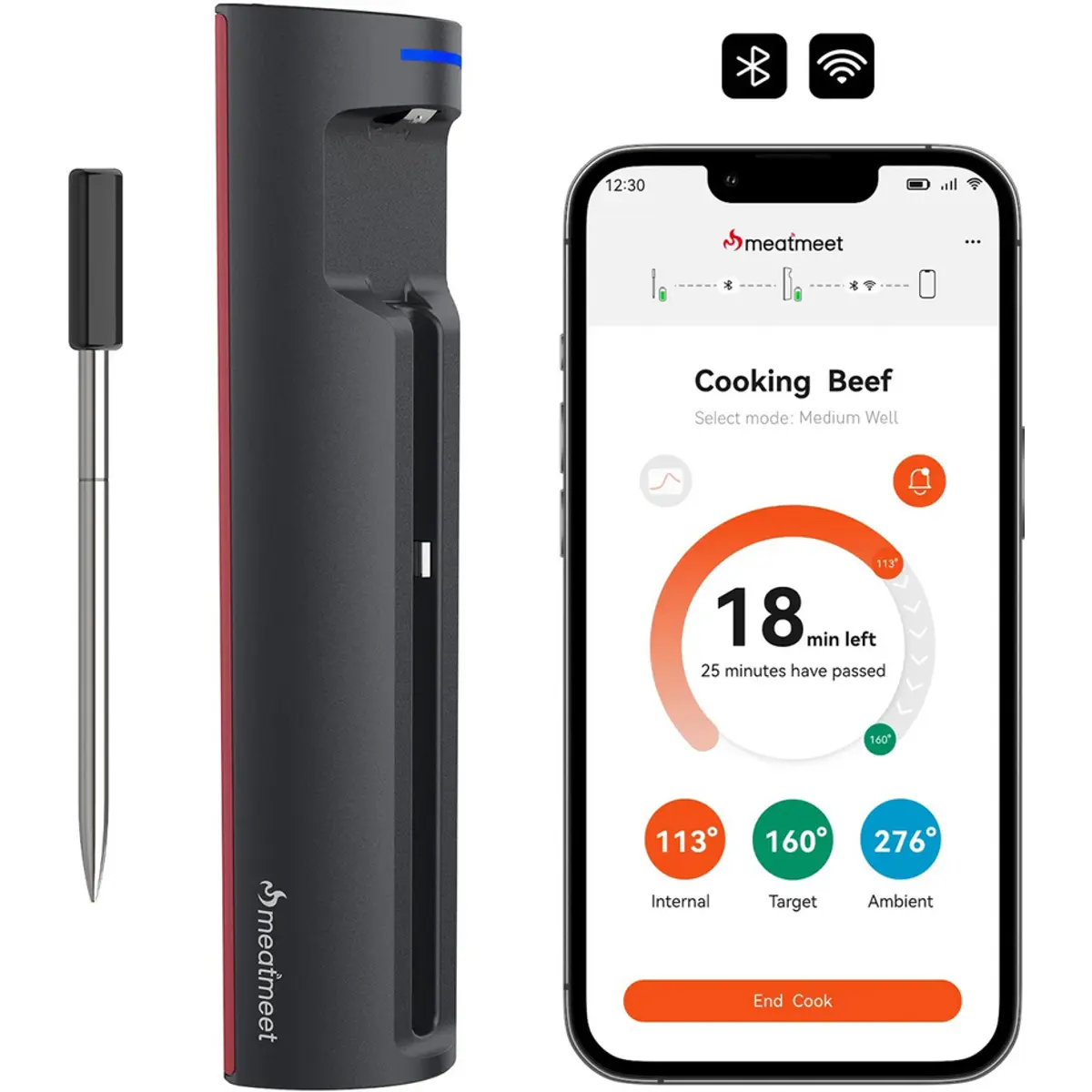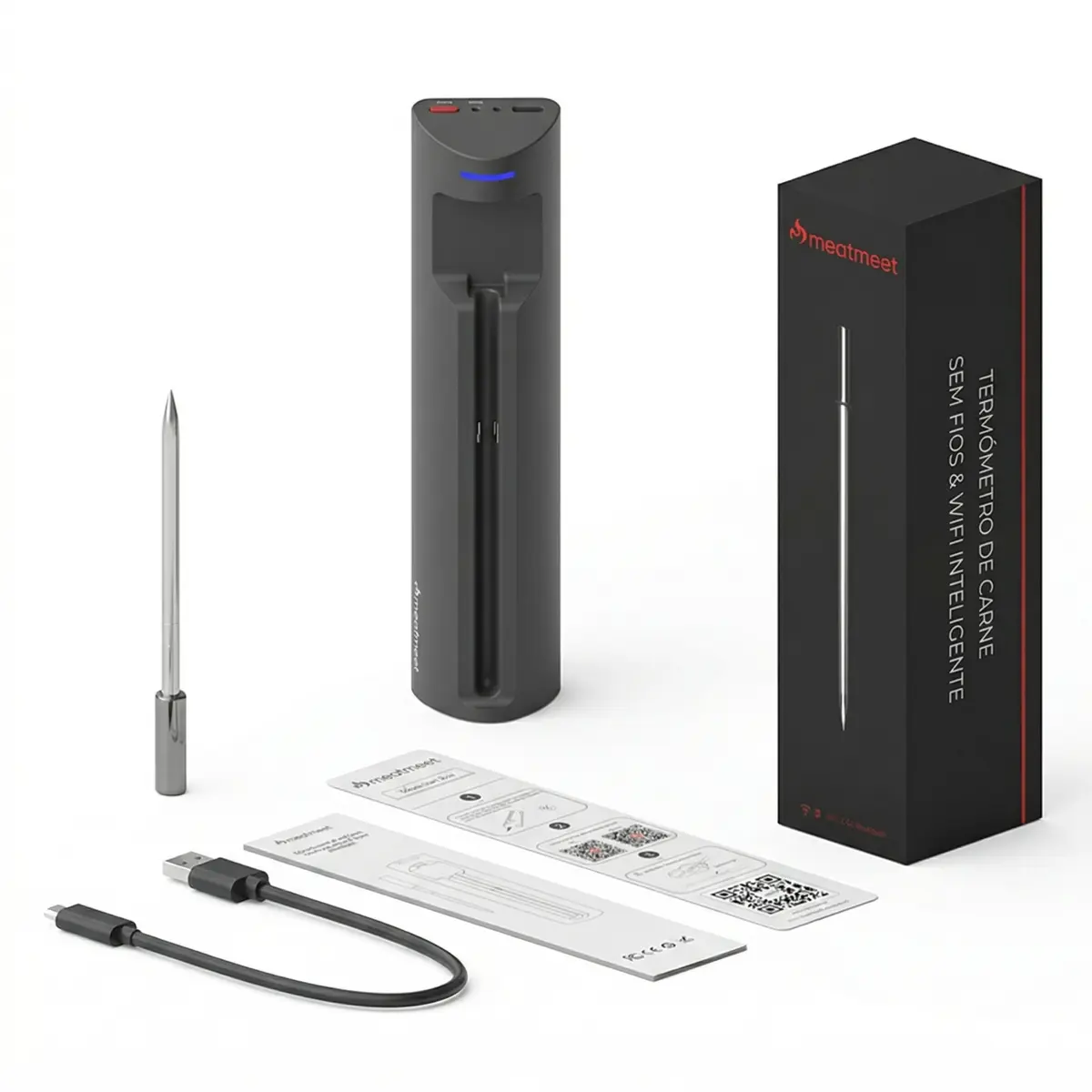 Termómetro avançado para controlo preciso da temperatura durante grelhados, assados e fumados. Equipado com sonda sem fios em aço inoxidável com múltiplos sensores internos e sensor ambiente, permite monitorização remota através de Bluetooth e WiFi. A aplicação dedicada orienta todo o processo de confeção, garantindo resultados consistentes tanto em interior como exterior.