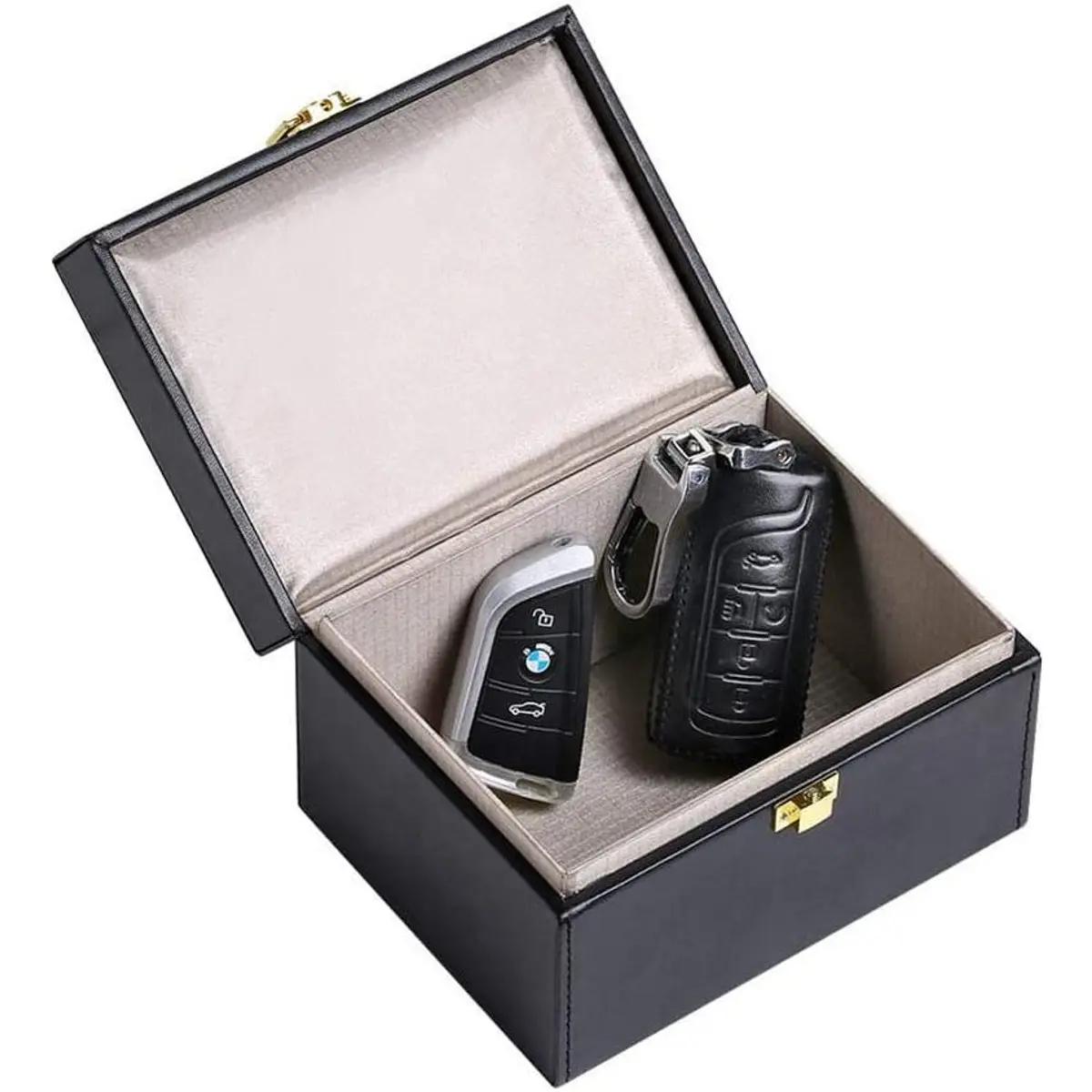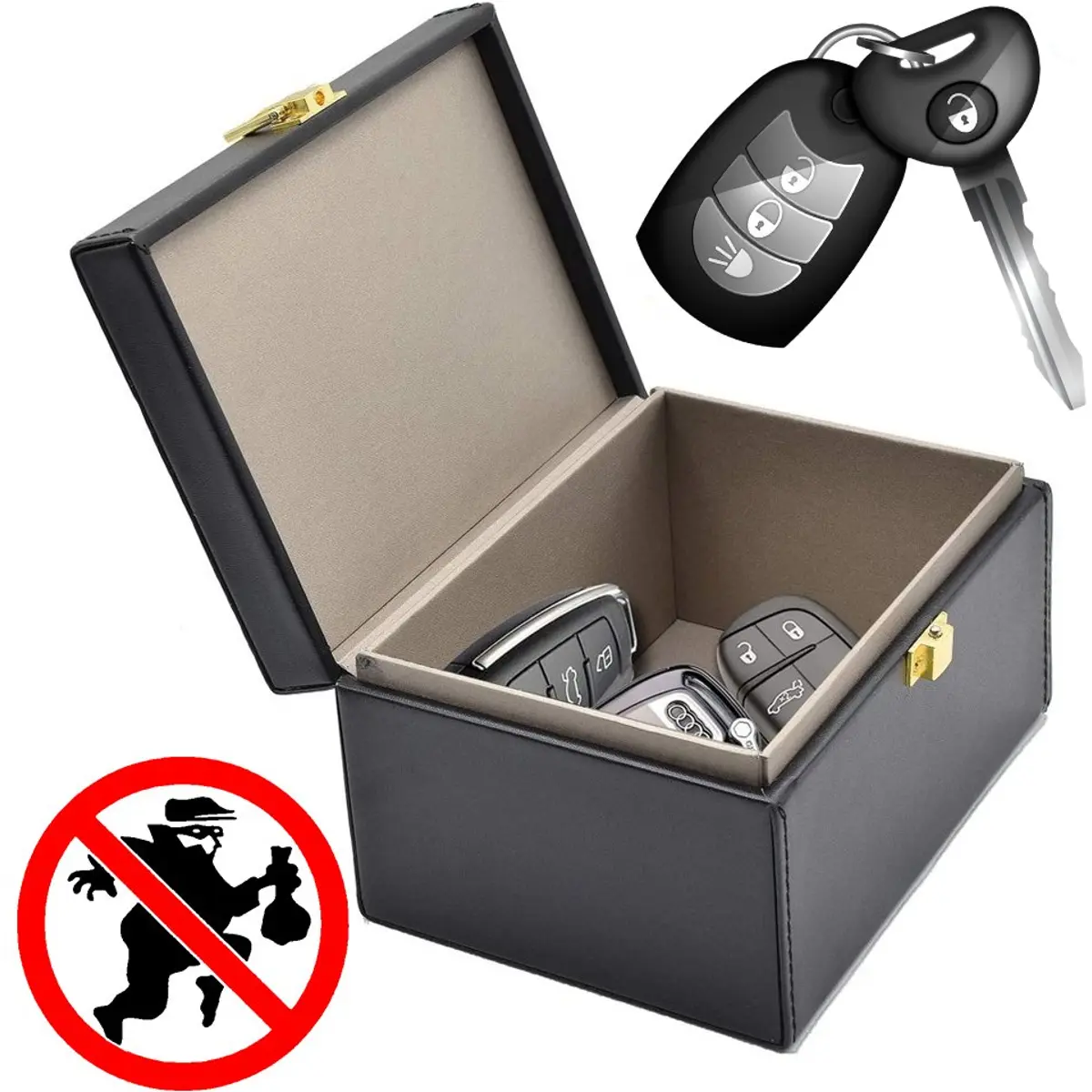Protege chaves de carro sem chave (keyless) contra roubo por amplificação de sinal. Ideal para armazenar várias chaves da família num só local seguro, prevenindo acesso remoto não autorizado.