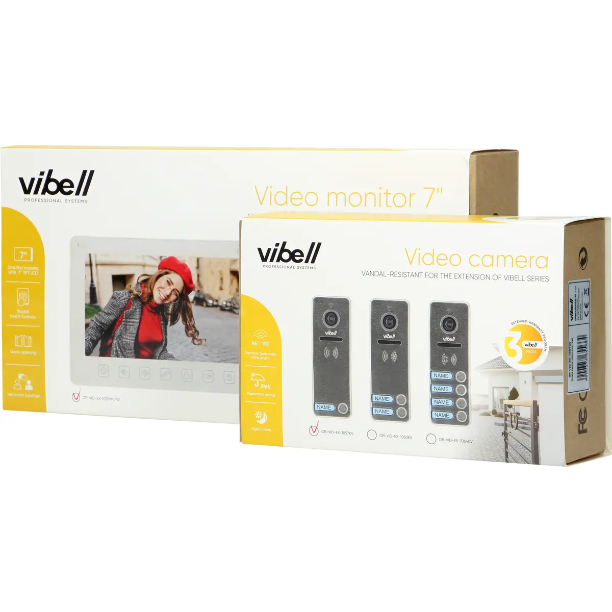 Kit videoporteiro modular com monitor LCD de 7 polegadas e câmara no painel de campainha. Funciona em modo de alta-voz sem monofone e possui menu OSD para ajustar rapidamente o monitor. Permite acrescentar painéis externos, monitores adicionais e câmaras CCTV, abrindo o portão. Alimentação da fechadura por fonte principal; transmissão por fio, 4 fios, com extensão para painel externo e monitor adicional. Câmara externa: ângulo de visão 96° vertical/110° horizontal, 700 TVL, IP65, LEDs brancos. Monitor: intercomunicação, 12 toques, não touchscreen, resolução 800x480, menus em Polaco e Inglês. Dimensões: painel 152x55x21 mm; monitor 185x127x17 mm.