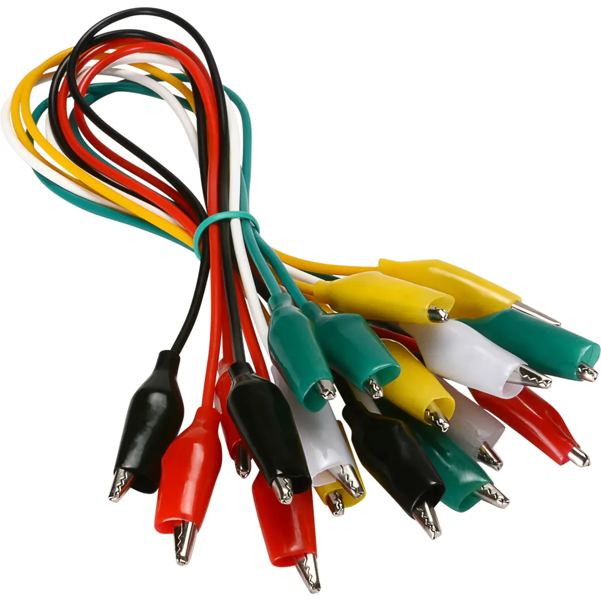 Conjunto de 10 crocodilos de 28 mm com cabo de 45 cm, ideal para trabalhos elétricos, prototipagem e ensaios em bancada. Feitos em aço níquelado com condutor, oferecem abertura máxima de 5 mm. Possuem isolamento por cores (preto, vermelho, branco, amarelo e verde) para identificação rápida de circuitos. Compatíveis com multímetros e placas de protótipo, proporcionam ligações seguras, fáceis e repetíveis em projetos de eletrónica.