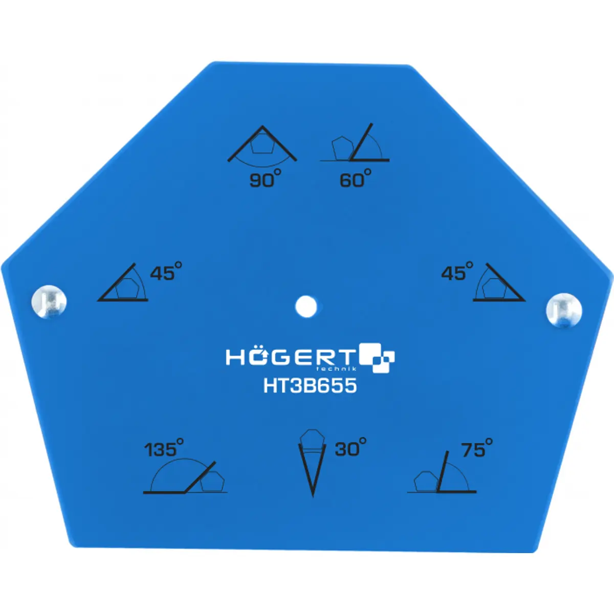 Esquadro magnético hexagonal para soldadura com corpo em chapa de aço revestida a pó e ímanes de ferrite de alta força, proporcionando fixação estável de peças durante soldagem, marcação ou levantamento. Permite posicionar componentes com precisão em ângulos de 30°, 45°, 60°, 75°, 90° e 135°. Estrutura robusta com rebites que asseguram estabilidade, elevada capacidade de levantamento de até 34 kg, ideal para trabalhos de montagem em metal.