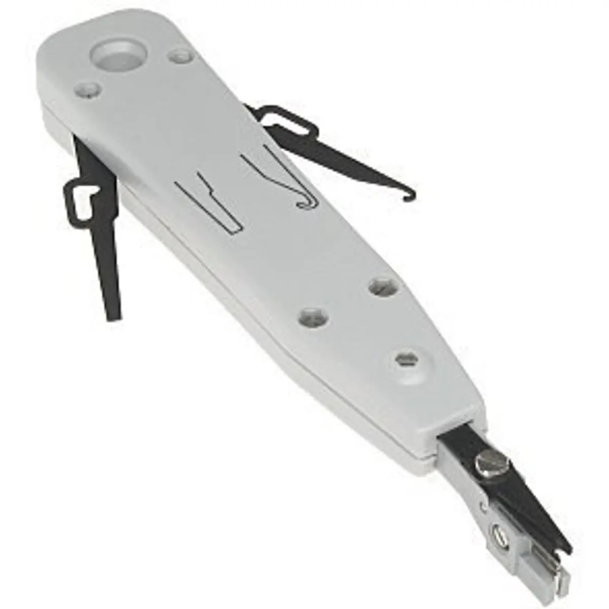 Ferramenta para cravar cabos em soquetes, tomadas ou patchpanels. Adequada para cravar condutores em conectores e painéis, facilitando trabalhos de montagem elétrica e de rede, sem referência a marcas.