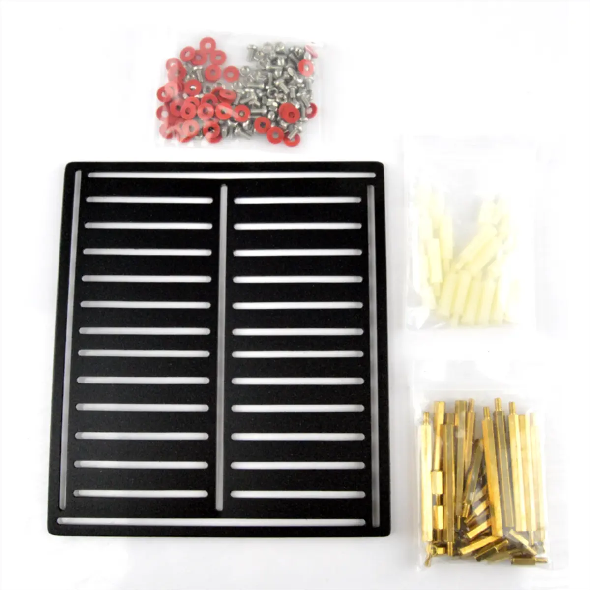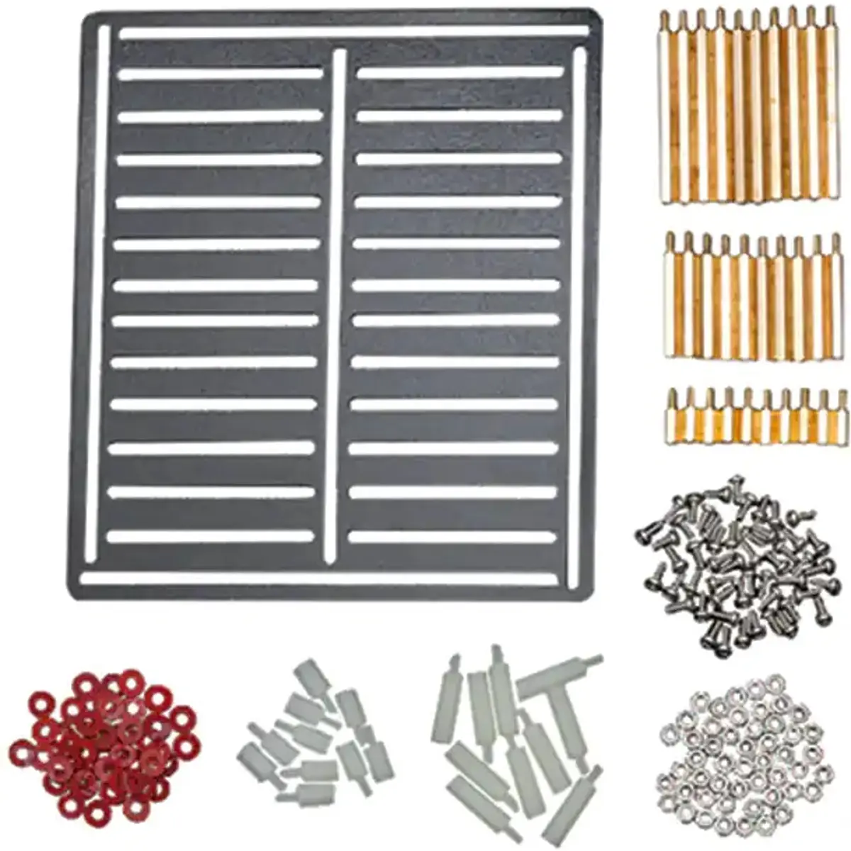 Esta é uma placa de prototipagem realmente fácil de usar. Basicamente, você pode colocar tudo, desde placas Arduino, sensores e até mesmo motores em cima dela. Vem acompanhada por 50 espaçadores hexagonais (tipo macho/fêmea), parafusos, porcas e anilhas.