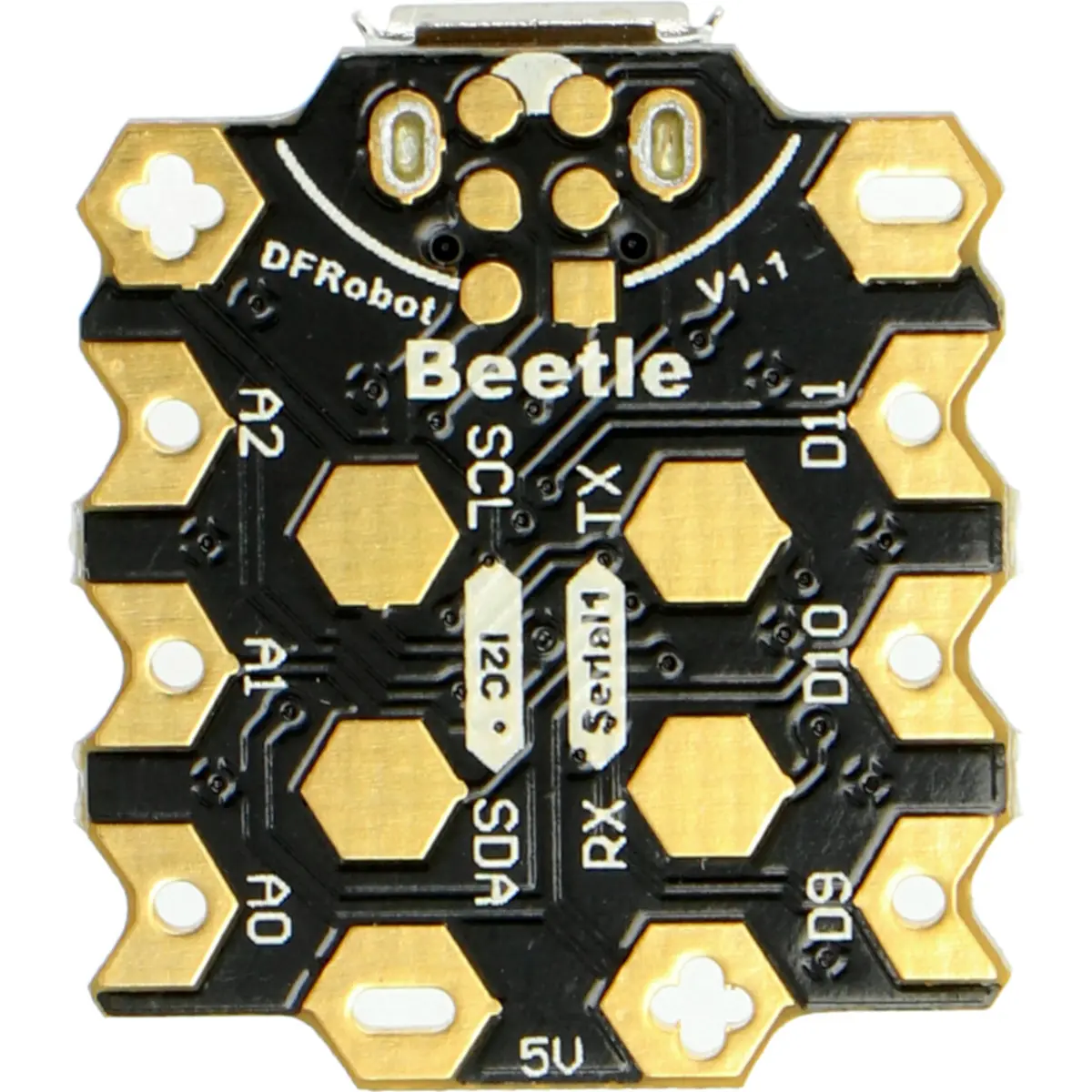 O Beetle da DFRobot é uma versão minimizada do Arduino Leonardo, mas que mantém as mesmas funcionalidades poderosas dessa placa. É baseado no ATmega32u4, tem clock de 16 MHz, possui 10 pinos digitais, 5 analógicos, 4 pinos PWM um I2C e uma interface UART.