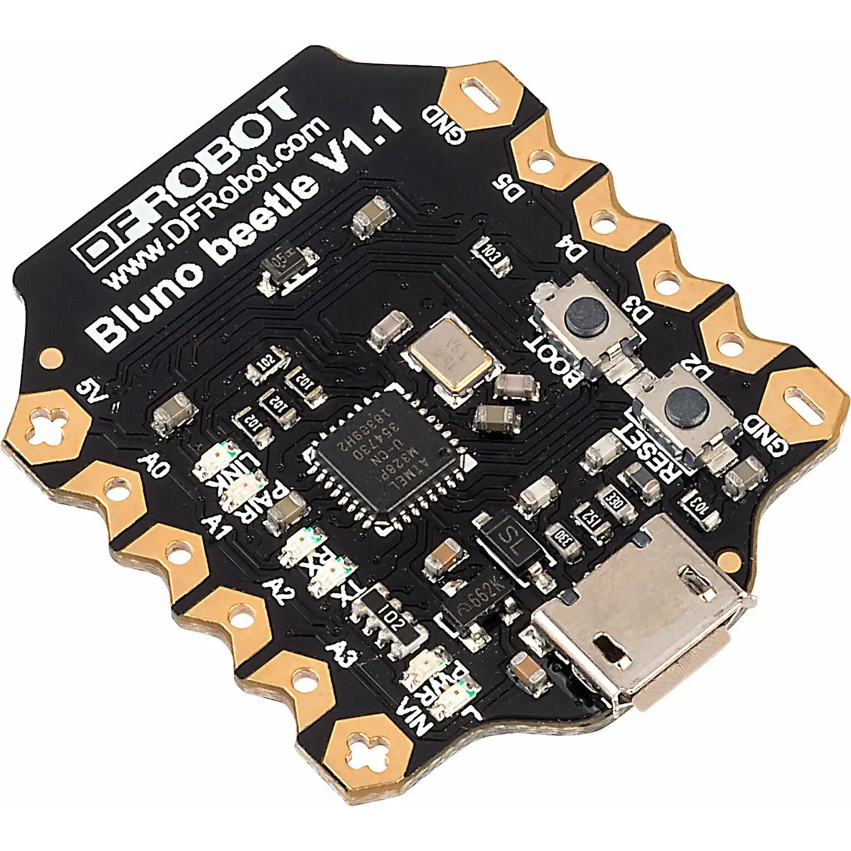 O Beetle Ble (nome anterior: Bluno Beetle) é uma placa baseada no Arduino Uno com Bluetooth 4.0 (BLE). É provavelmente a mais pequena placa BLE do mercado. Ele usa o Arduino IDE padrão para fazer upload de programas sem necessidade de bibliotecas ou drivers extras.