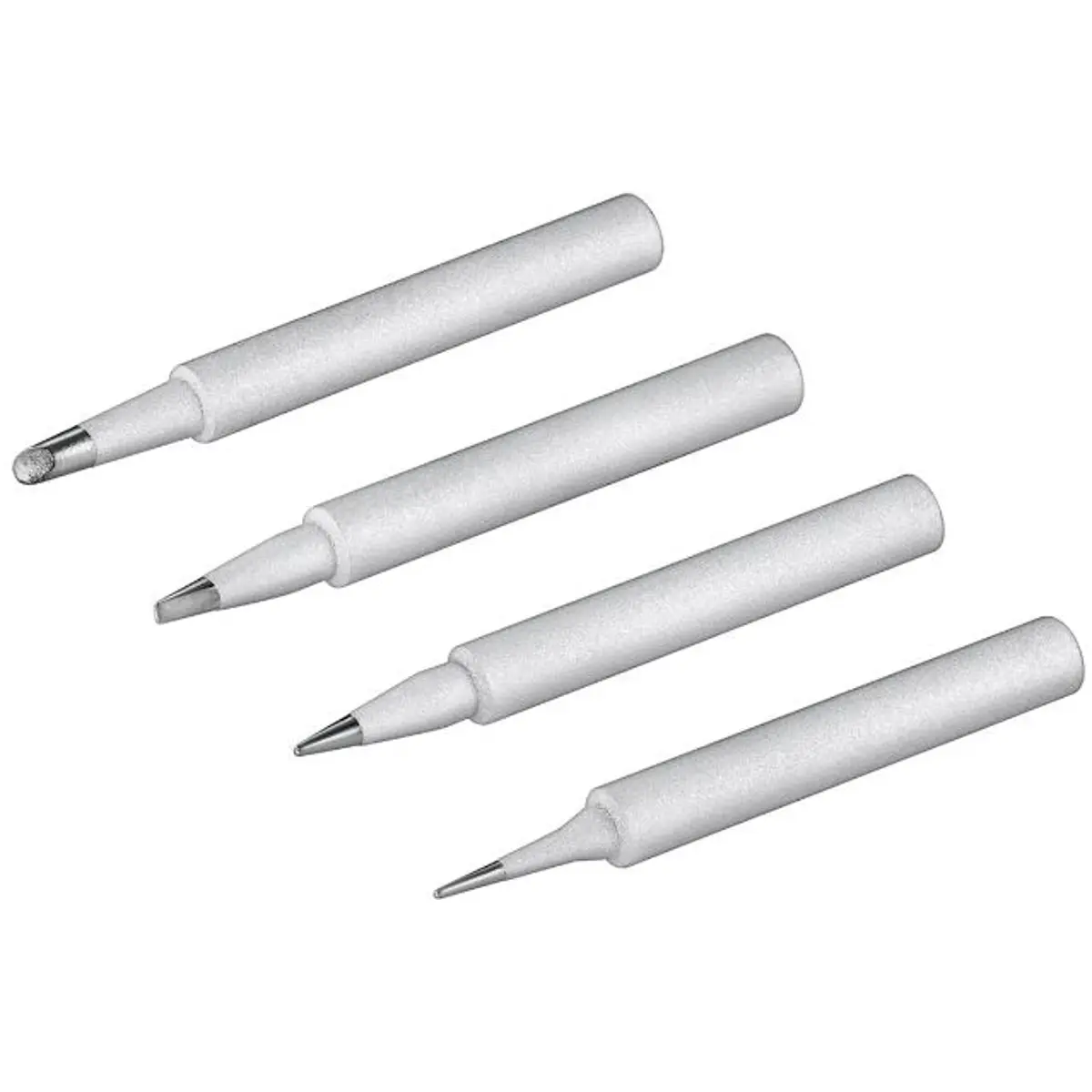 Conjunto de quatro pontas de substituição para estações de solda, incluindo ponta de 1mm, ponta de 0,3mm, ponta plana de 2,0mm e bisel de 45°. As pontas têm 17mm de ponta e 65mm de comprimento total, com diâmetro interno de ø6,0mm. Compatíveis com as estações ZD-929A/B/C, ZD-931, ZD-932 e ZD-937, bem como com os ferros 096-1587, 096-0382, 096-1527, 096-1664, 096-1665 e 096-2271. Ideal para solda precisa e substituição rápida.