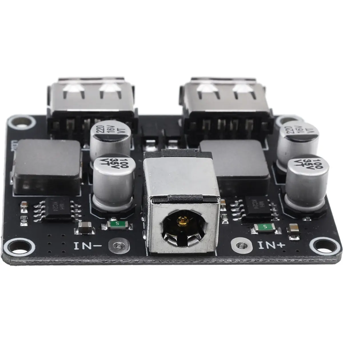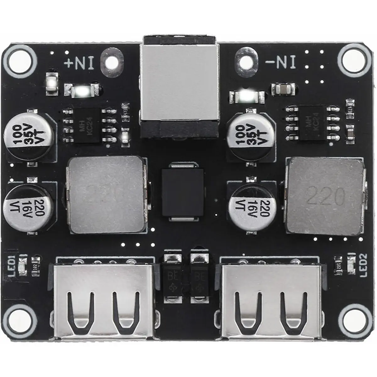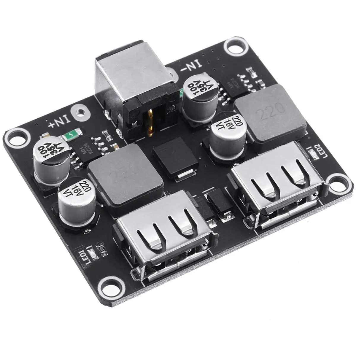 Possui uma entrada de 6 a 32V e duas saídas de 3 a 12V (padrão 5V). A tensão pode ser alterada por meio de um módulo trigger de carregamento rápido e os 2 canais funcionam de forma independente.