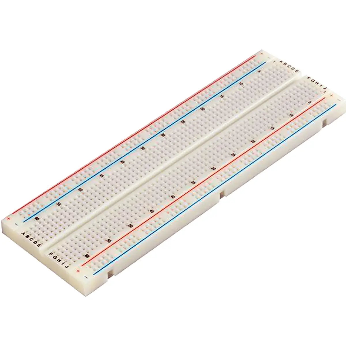 Placa de ensaio branca com base de fita bi-adesiva para fixação. Dimensões de 165 x 54 x 8,5 mm e 830 contactos, ideal para montagem de circuitos eletrónicos em prototipagem sem soldar, facilitando a organização de ligações numa superfície compacta.