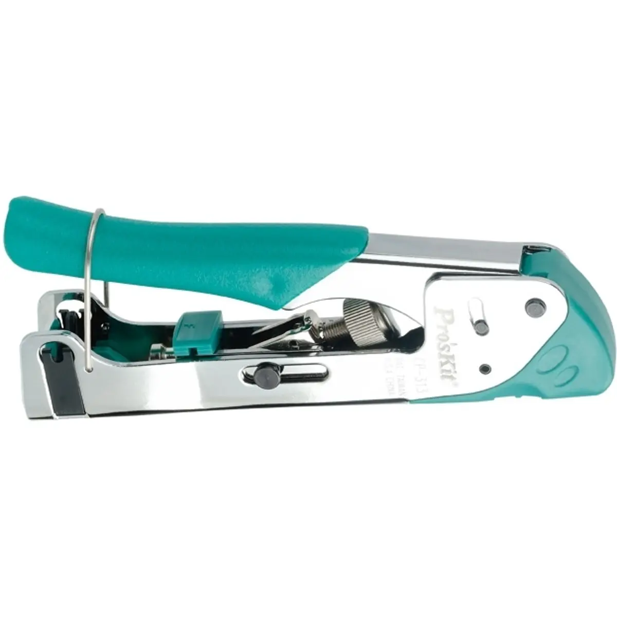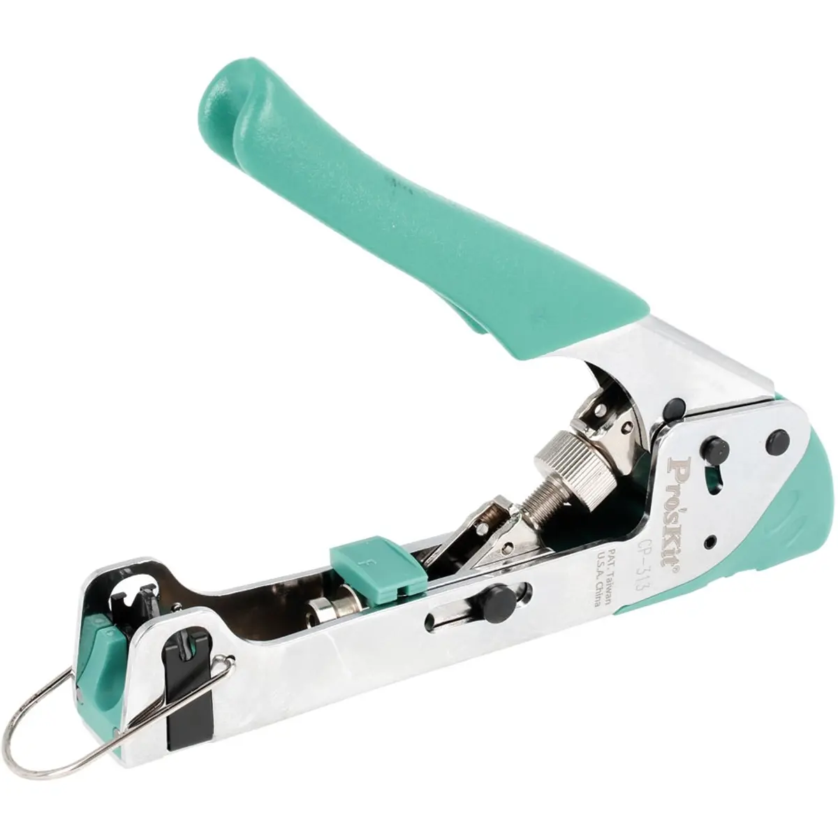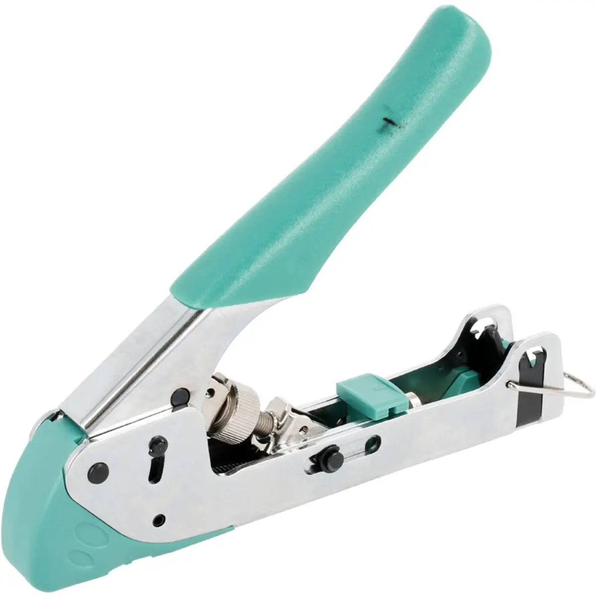 Alicate com design universal, ajustável, para cravar diversos tipos de fichas de compressão.