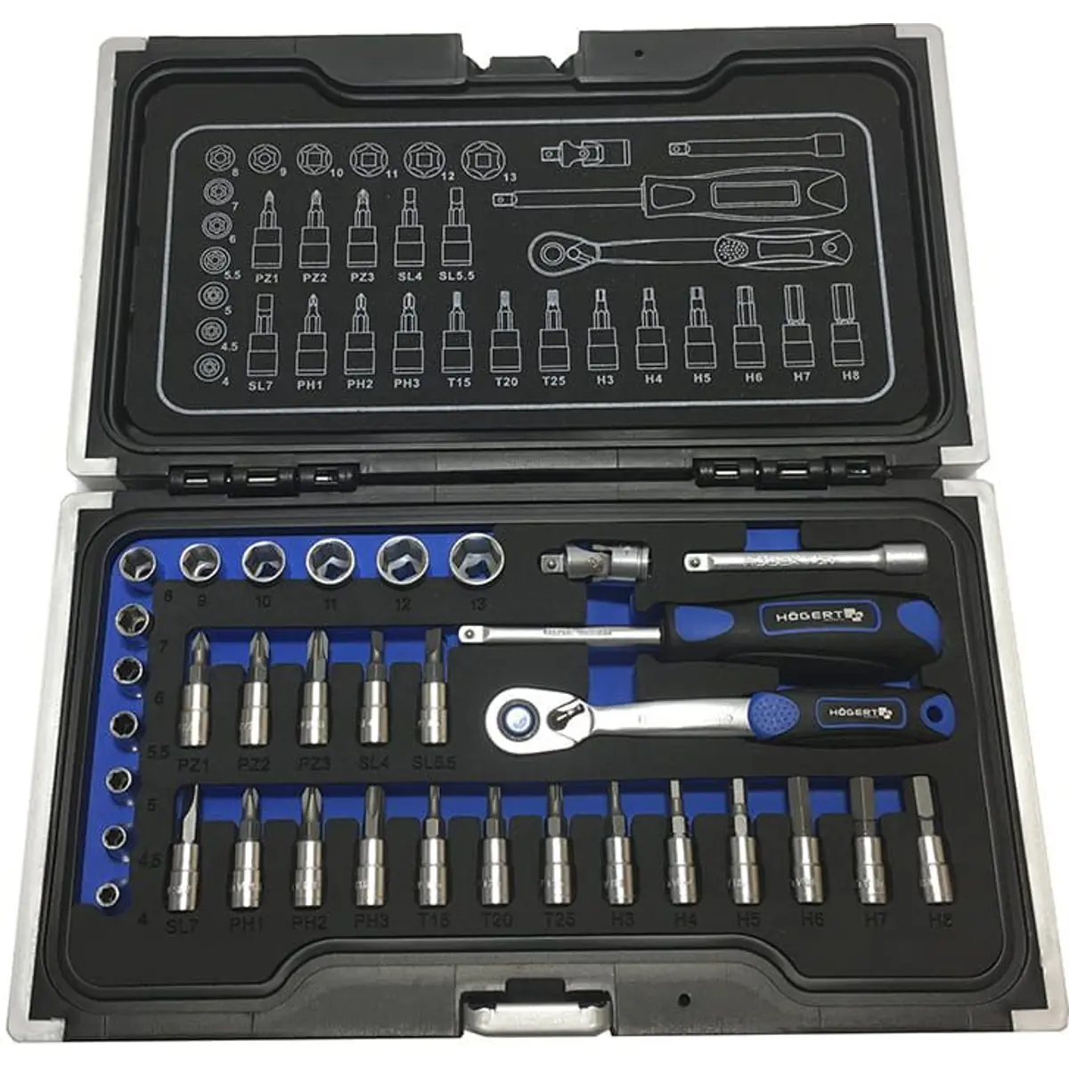 Conjunto de chaves de caixa de 1/4", pontas de chave de parafusos (Bits) e acessórios.