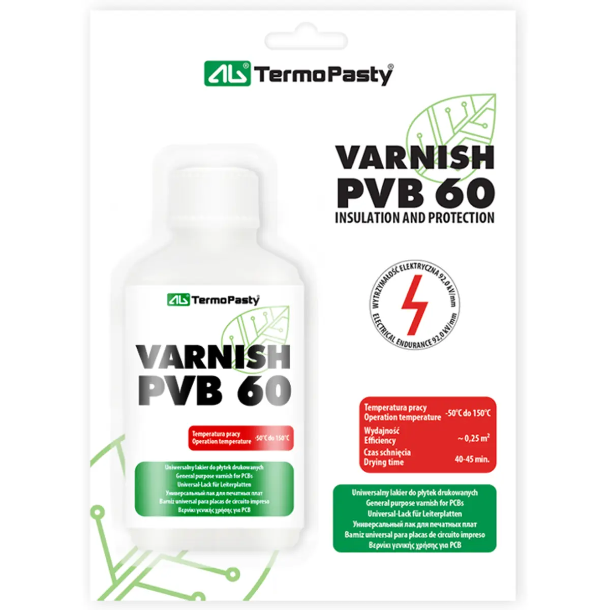 Verniz PVB transparente de secagem rápida com boas propriedades de isolamento. Protege PCBs e outros elementos operando em condições climáticas adversas contra corrosão. O revestimento protege os PCBs contra a formação de correntes parasitas e curtos-circuitos.