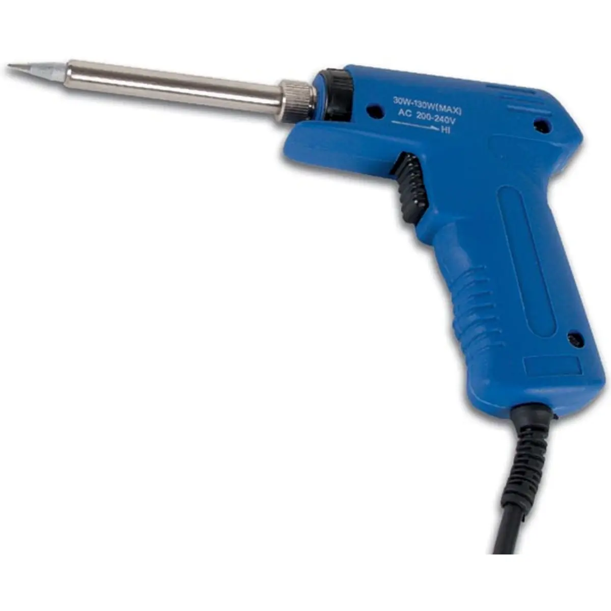 Pistola de soldar, 20W/130W, imprescindível para aplicações em campo. Com duas potências facilmente seleccionáveis através de botão de pressão estratégicamente posicionado na pega do ferro. Robusto e leve este auxiliar revelar-se-á uma grande ajuda no seu dia-a-dia.