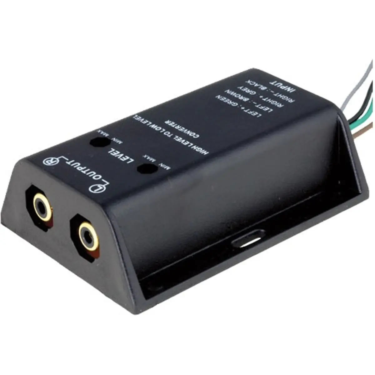 Converte o sinal de saída de colunas do autorádio em duas saídas de baixa frequência (ficha RCA), para ligação a um amplificador.