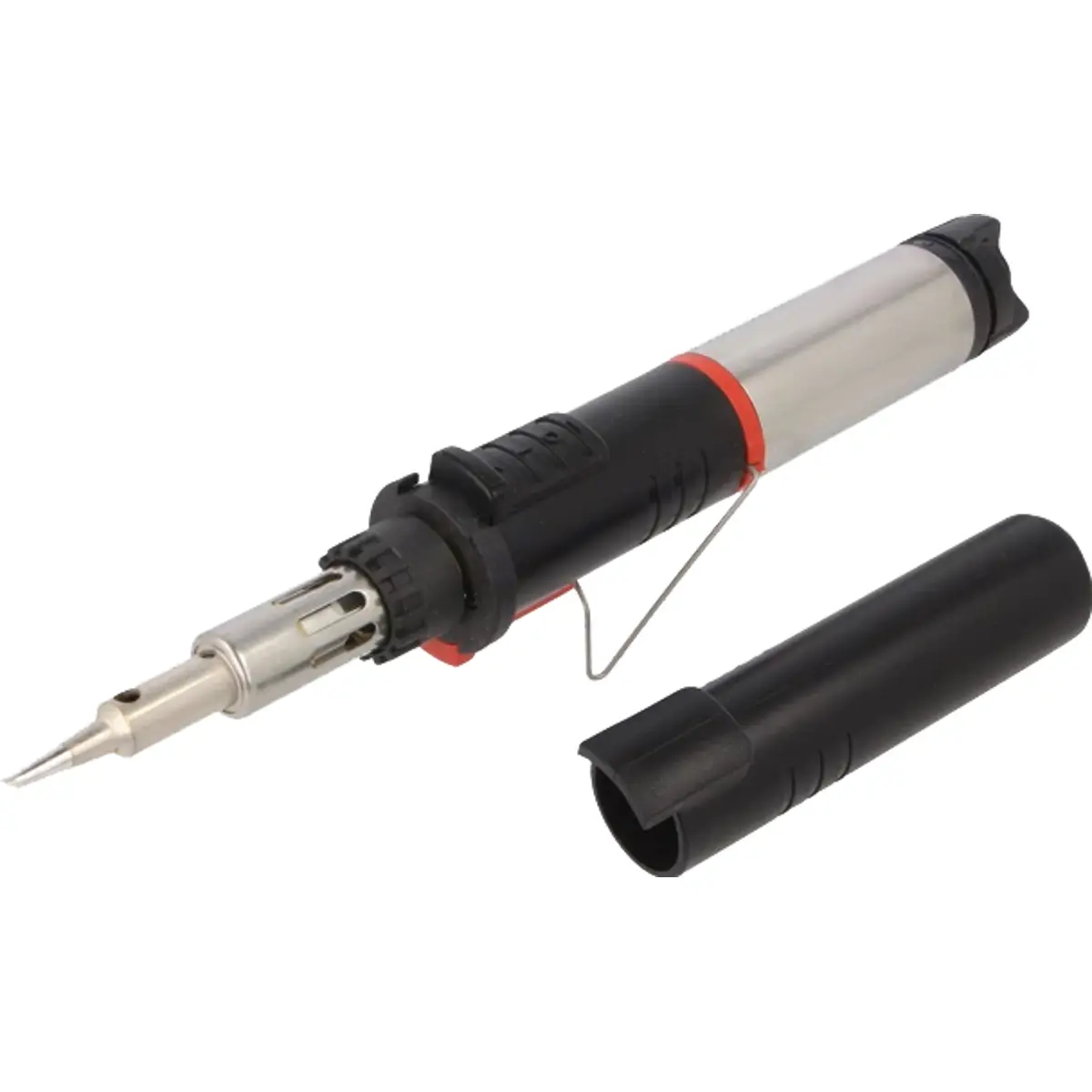 Ferro de soldar a gás com regulação de potência e várias pontas, incluindo SF2.4, ideal para reparações sem energia eléctrica. Permite três modos de funcionamento para diversos trabalhos. A ignição piezoelétrica facilita o arranque. Alcança 580°C para solda, 625°C para ar quente e 1300°C na chama, usando gás butano com depósito de 15 cm3. A autonomia é de até 2 horas a potência média; peso em vazio 150 g, compacto e portátil para trabalhos no local.
