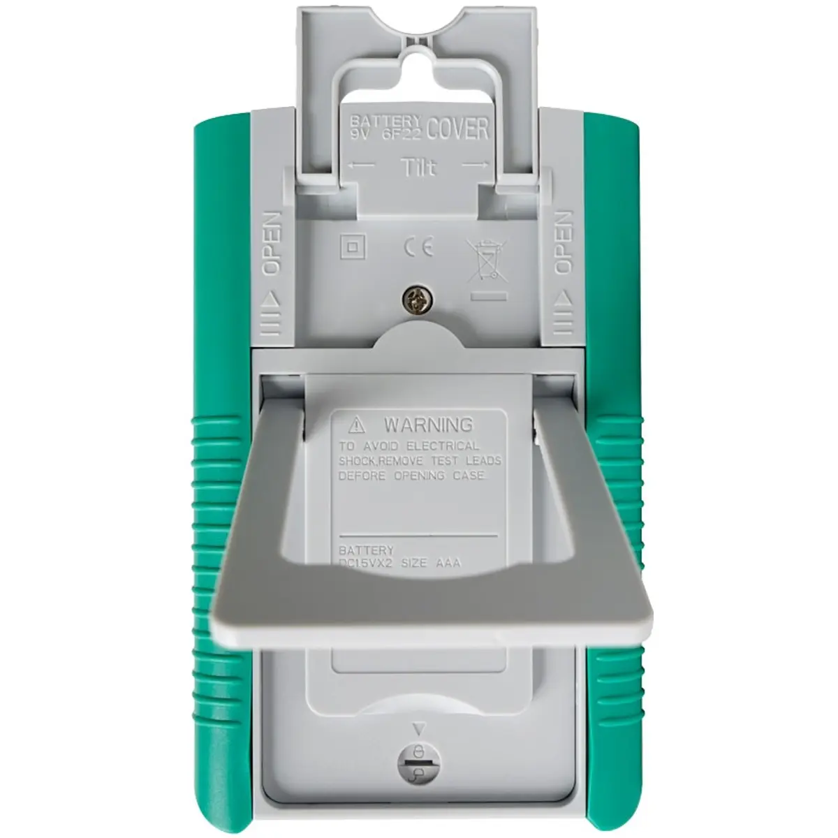 Este multímetro analógico permite medições elétricas fundamentais, incluindo tensões DC e AC até 1000V, corrente DC até 10A, resistência até 20 MΩ e capacidades entre 0,025 e 2000uF. Dispõe de teste de continuidade com beep até 200 Ω, verificação de baterias e teste de transístores (hFE) de 0 a 1000. O painel frontal inclui um seletor de escalas e ajuste de zero ohm. Alimenta-se com pilhas AA e 9V (não incluídas); protegido para 0,5A/250V e 10A/250V; dimensões 160x105x40 mm; peso 390 g.