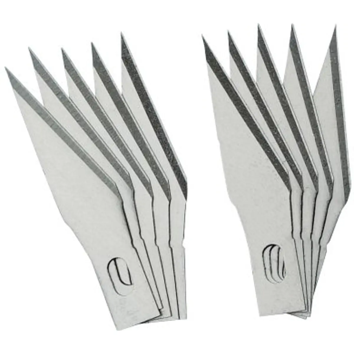 Conjunto de lâminas de substituição com 10 unidades para faca de lâmina retrátil. Destinadas a substituição rápida em ferramentas de corte de precisão, sem referência a marcas. Ideal para manter cortes consistentes e qualidade de acabamento em trabalhos de precisão.