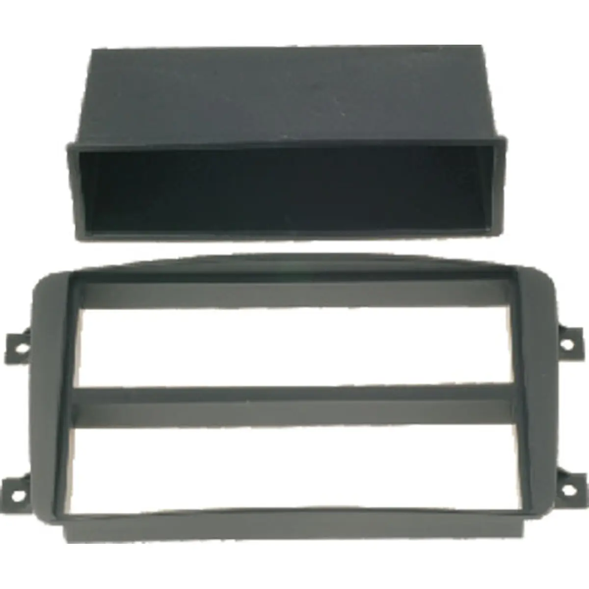 Moldura de encaixe para rádio automóvel, em preto, com sistema 2 ISO. Compatível com Mercedes C-Class W203 (2000-2004), C-Class Sport Coupé (2000-), C-Class T-model (2001-), CLK. Permite substituir a moldura original do rádio mantendo um acabamento discreto e integração harmoniosa com o interior. Ideal para upgrades estéticos ou substituições simples, sem necessidade de alterações elétricas, mantendo o suporte de montagem original e o alinhamento de painéis.