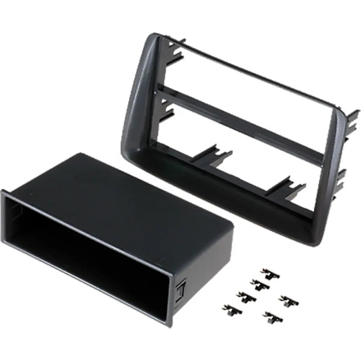 Moldura para rádio automóvel cinzenta com prateleira, versão ISO 2, destinada ao Fiat Panda 2003. Mantém o encaixe adequado e o visual original do interior, proporcionando uma montagem estável para rádios ISO 2 sem comprometer o estilo do interior do veículo.