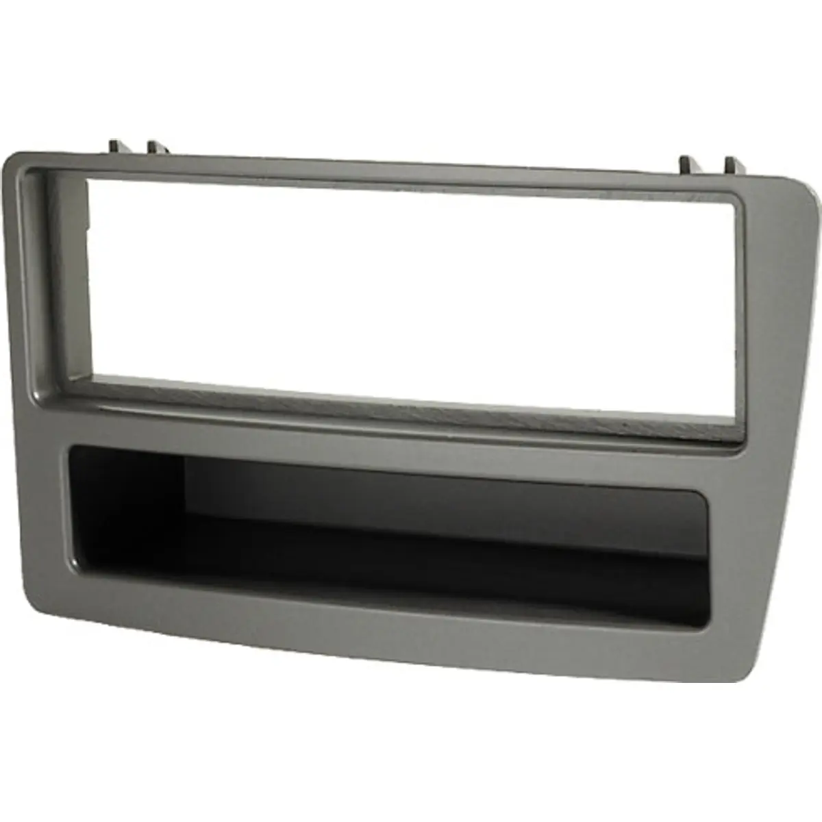 Moldura prata de montagem 1 DIN para rádios automóveis, compatível com veículos equipados com ar condicionado automático. Destina-se a melhorar a integração de rádios padrão 1 DIN no interior do veículo, oferecendo ajuste adequado e acabamento simples.