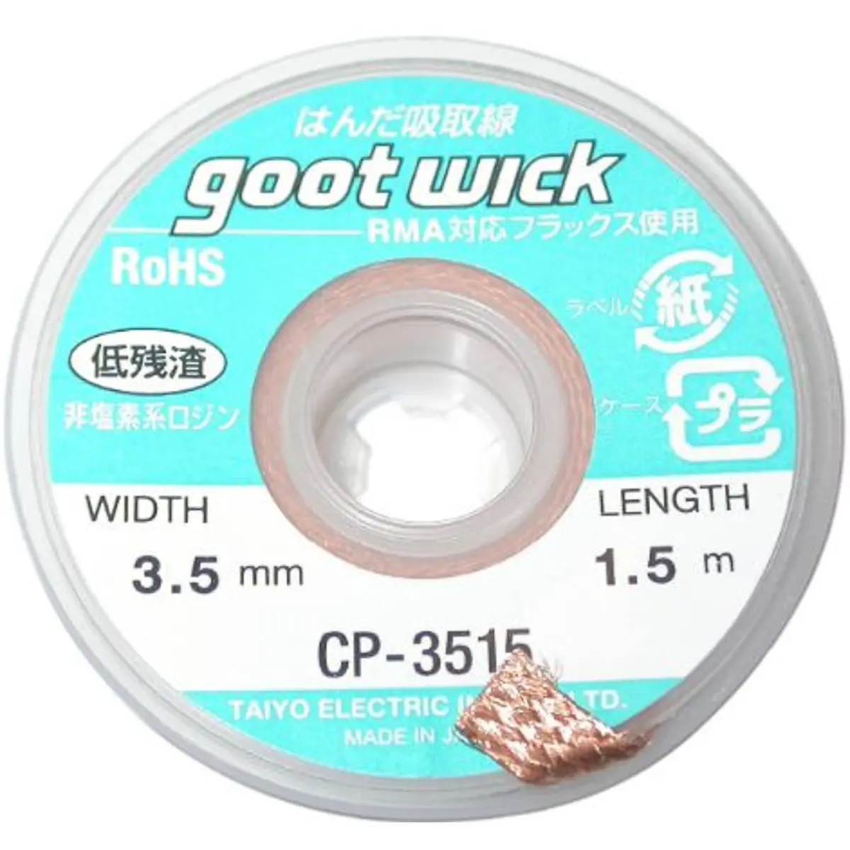 A malha de dessoldar GOOT é reconhecida mundialmente, graças a sua qualidade que garante ao utilizador agilidade, precisão e ótimos resultados. É produzida em cobre e indicada para realizar limpeza e remoção de estanho em placas e componentes electrónicos, Absorve o excesso de solda, reduzindo significativamente o tempo de trabalho e minimiza o risco de danos causados pelas altas temperaturas aplicadas sobre a placa electrónica.
