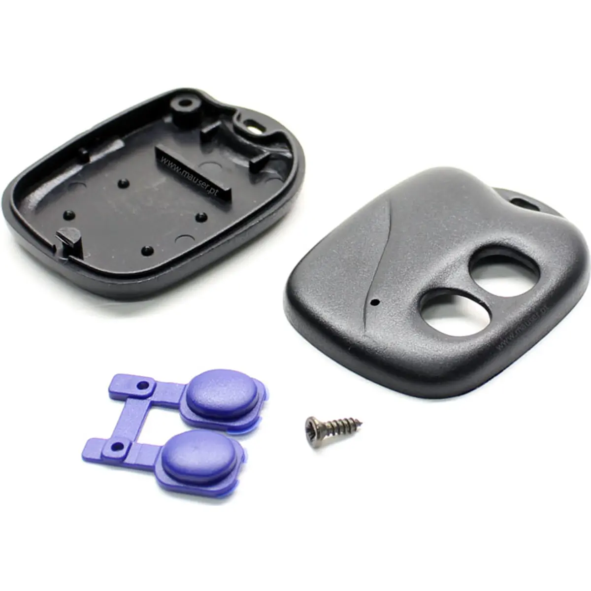 Proteção em ABS para comandos à distância, com acabamento preto e atuadores azuis. Alojamento compacto que oferece durabilidade, leveza e montagem simples com parafuso incluído e espaço para atuadores. Ideal para aplicações de controlo remoto, garantindo proteção mecânica, isolamento elétrico e fácil acesso para manutenção ou substituição de componentes.