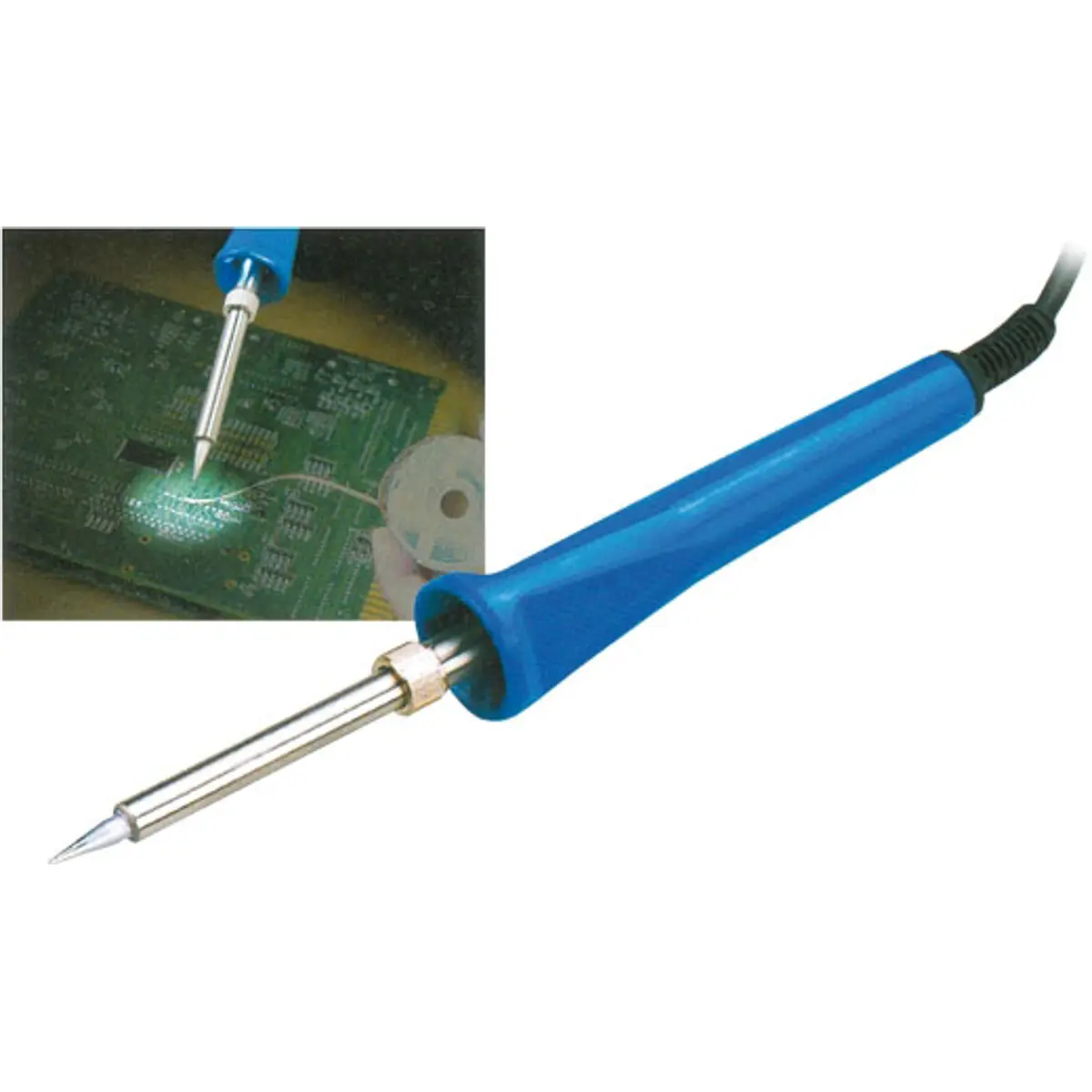 Ferro de soldar de 230V com potência de 30W e iluminação LED integrada para facilitar a visualização da área de solda. Inclui ponta de 0,5 mm para trabalhos finos e detalhados, adequada a soldas em componentes pequenos. Ideal para uso em bancada, oficinas e ambientes domésticos, oferecendo uma ferramenta simples de usar para tarefas de solda básicas sem depender de iluminação externa.
