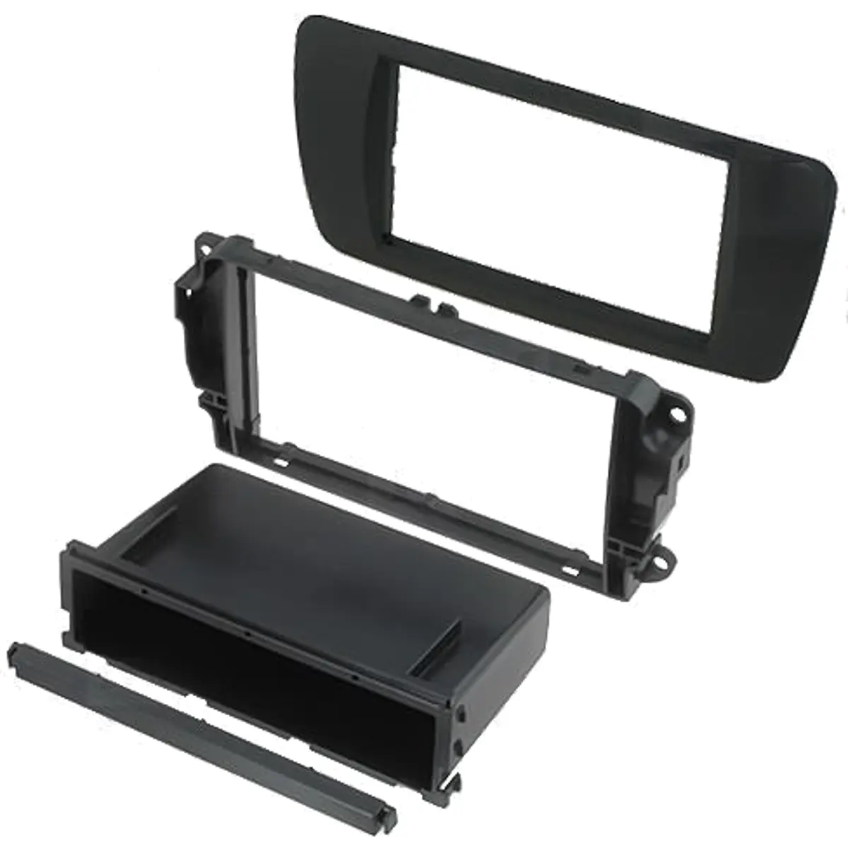 Moldura de 2 DIN para rádios de frente plana, em cinzento Dublin, adequada a aparelhos com abertura frontal de 97x170 mm e gaveta metálica de 102x181 mm. Compatível com rádios de esquema 2 DIN, oferece encaixe estável e acabamento discreto na consola central, mantendo a estética original do veículo Seat Ibiza 2008. Ideal para instalação simples, sem modificação estrutural, com adaptação limpa entre rádio e moldura e suporte para montagem segura.