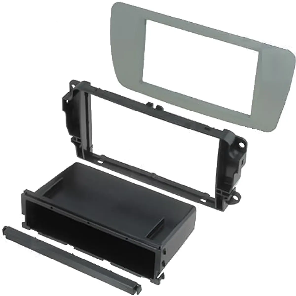 Moldura de montagem para rádio de 2 DIN na cor cinzento, compatível com Ibiza 2008. Ideal para substituir a moldura original numa instalação de rádio de 2 DIN, oferecendo um encaixe estável, acabamento discreto e integração estética no interior do veículo. Esta moldura facilita a instalação de rádios padrão de 2 DIN, mantendo o visual do tablier e a funcionalidade sem comprometer a estética.