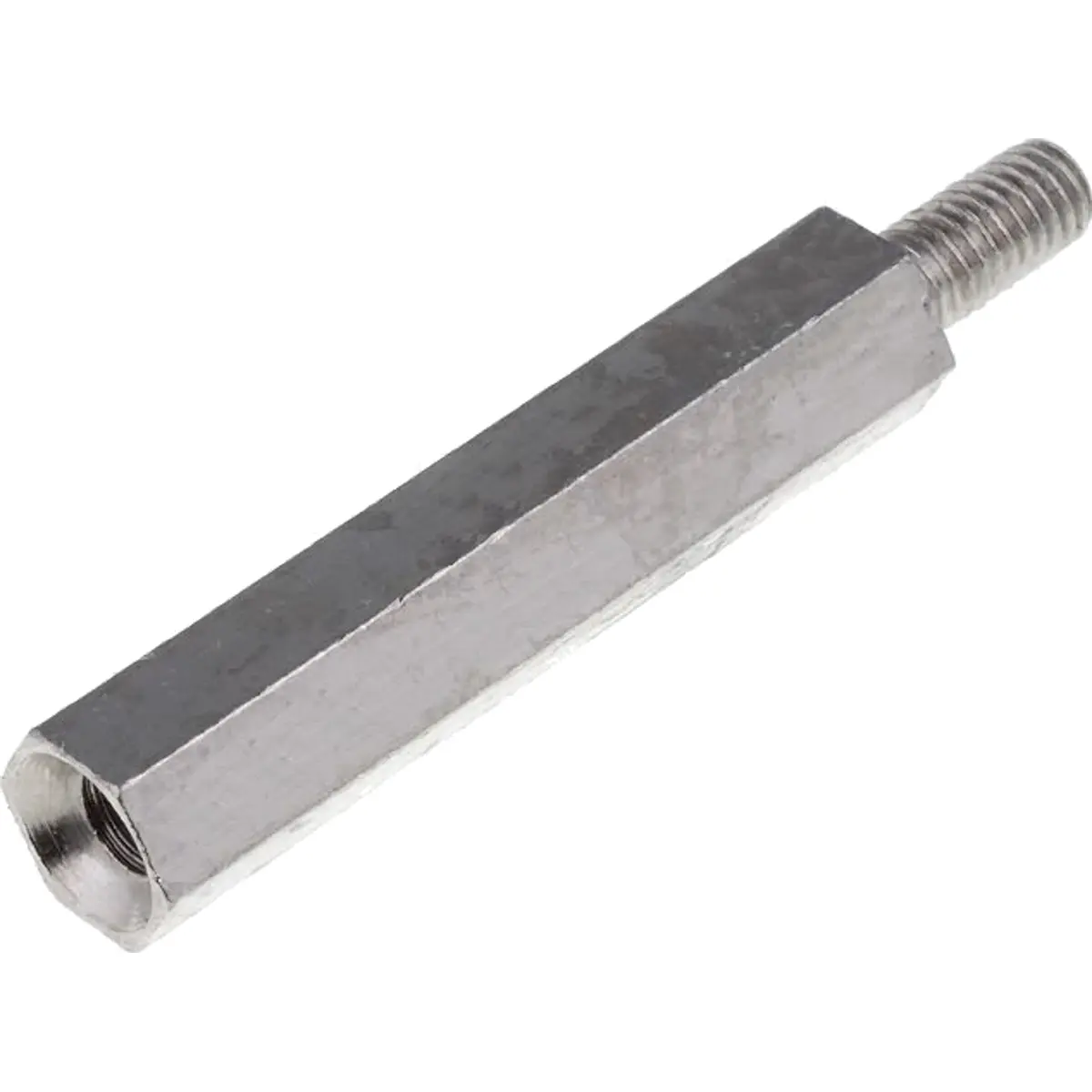 Espaçador fêmea/macho M3 em latão níquelado com distância de 25 mm. Possui roscas M3 interna e externa, formato hexagonal e chave de 5 mm para montagem. Ideal para fixação de componentes com roscas M3, oferecendo resistência à corrosão graças ao latão níquelado e à cobertura de níquel. Adequado para aplicações de montagem em engenharia mecânica.