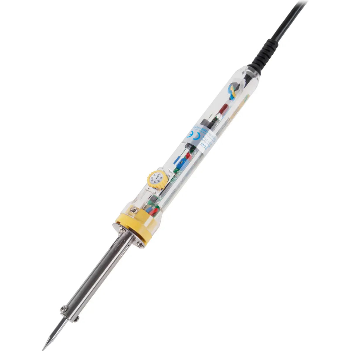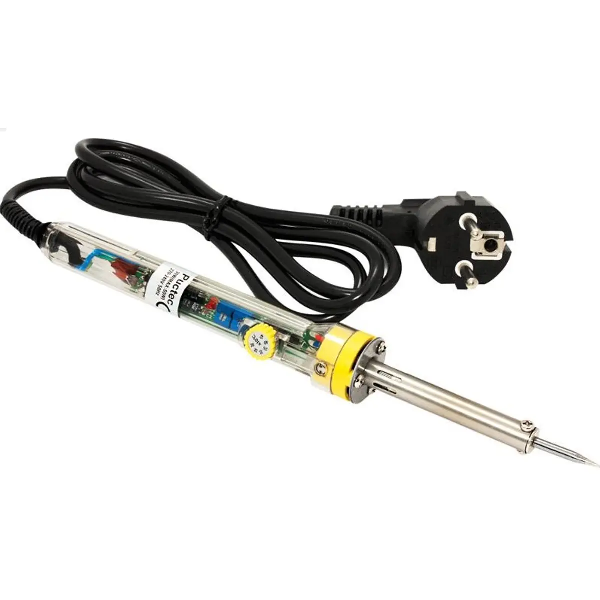 Ferro de soldar com tensão entre 220-240V AC e potência de 30W, oferecendo temperatura regulável de 200°C a 500°C. Aquece até à temperatura de soldadura em cerca de 45 segundos. Possui ponta sem chumbo de longa duração e ligação à terra fiável para maior segurança. O tubo em aço inoxidável e a resistência de aquecimento de qualidade garantem durabilidade e desempenho estável para soldadura profissional. Ideal para trabalhos de precisão, com controlo de temperatura simples e seguro, adequado a ambientes industriais ou de oficina.