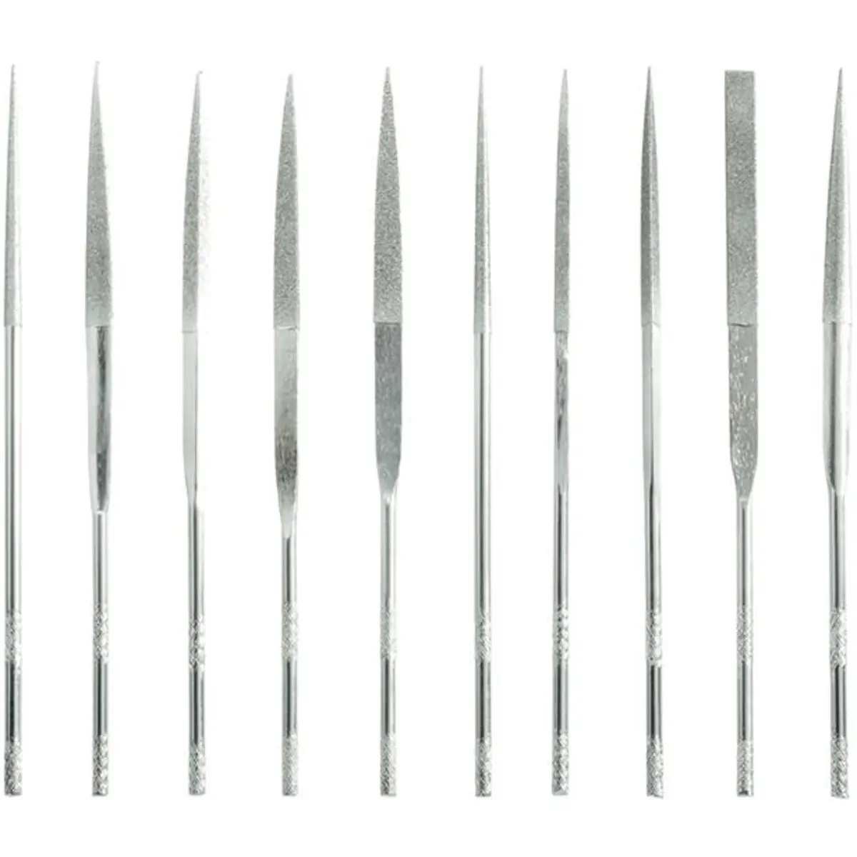 Este conjunto de 10 limas de precisão, com camada de diamante, permite trabalhar com metais, vidro e cerâmica graças à dureza do diamante. Realiza cortes e acabamentos finos em aço-carbono; as limas diamantadas conservam o fio e proporcionam resistência ao desgaste. Inclui formas como quadrado, cruz, ponta plana, meia-cana, plano, duas triangulares, faca e redondas para diferentes situações de modelagem e acabamento. Ideal para trabalhos de precisão em oficina.