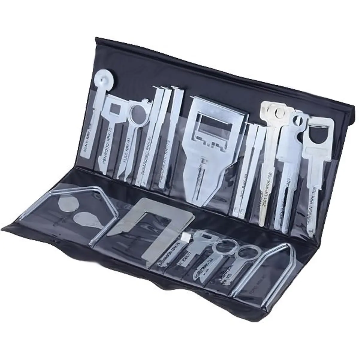 Kit de ferramentas extratoras para rádios de automóvel, concebido para facilitar a remoção de rádios em painéis sem danificar. Compatível com rádios das marcas Clarion, JVC, Kenwood, Panasonic, Pioneer e Sony, e com veículos das marcas Audi, Fiat, Ford, VW e Pontiac. Ideal para substituição, reparação e manutenção de sistemas de áudio automotivos, utilizado por oficinas e profissionais, com montagem simples e segura.