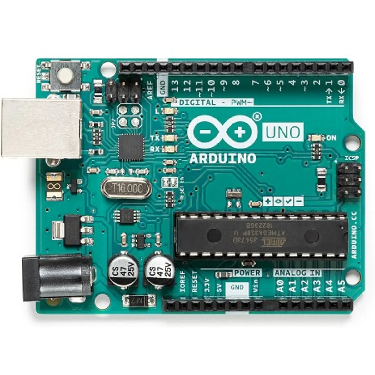 Arduino Uno é uma placa microcontroladora baseada no ATmega328P. Possui 14 pinos de entrada / saída digital (dos quais 6 podem ser usados como saídas PWM), 6 entradas analógicas, um cristal de quartzo de 16 MHz, uma conexão USB, um conector de energia, um conector ICSP e um botão de reset. Contém tudo o que é necessário para suportar o microcontrolador;