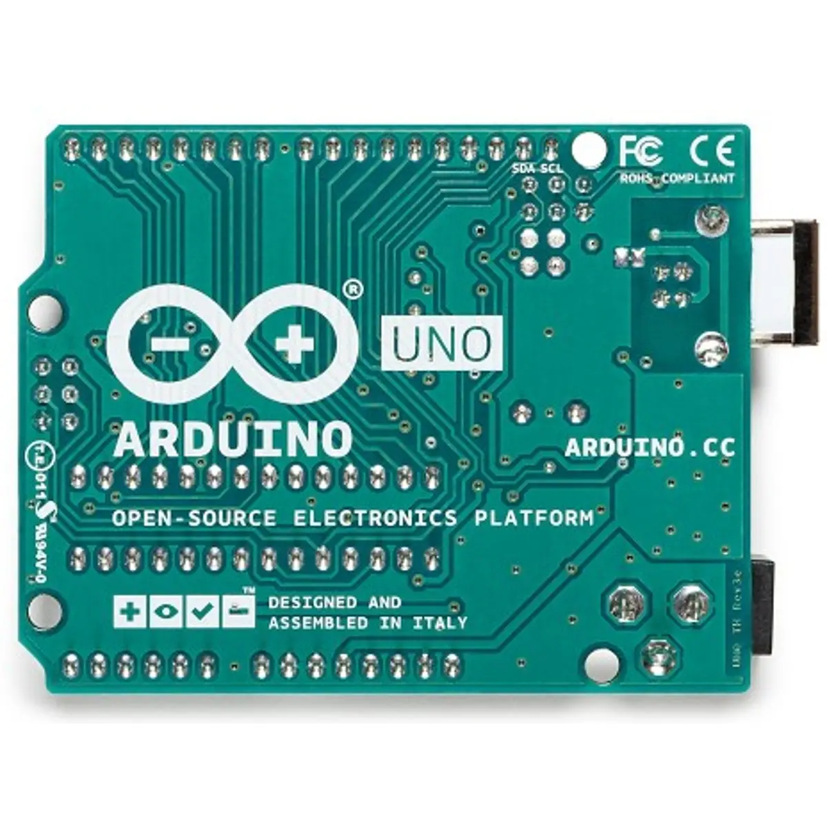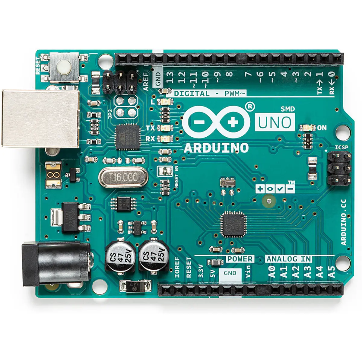O Arduino Uno SMD R3 é uma placa microcontrolador baseada no ATmega328. tem 14 pinos de entrada / saída digital (dos quais 6 podem ser usados como saídas PWM), 6 entradas analógicas, um oscilador de cristal de 16 MHz, uma conexão USB, um conector de energia, um conector ICSP e um botão de reset. Contém tudo o que é necessário para suportar o microcontrolador; Basta conectá-lo a um computador com um cabo USB ou ligá-lo a um adaptador de CA-CC ou bateria para iniciar.