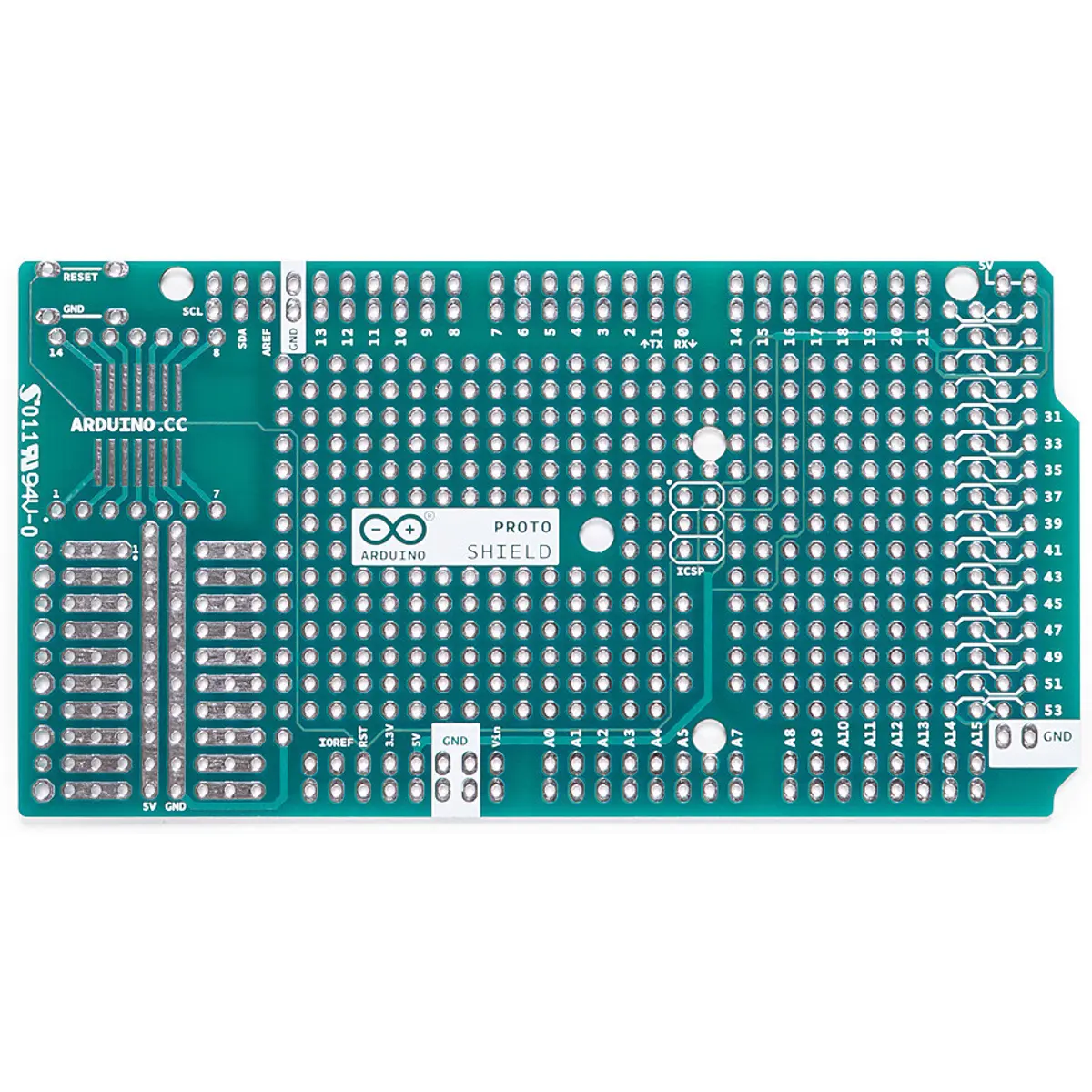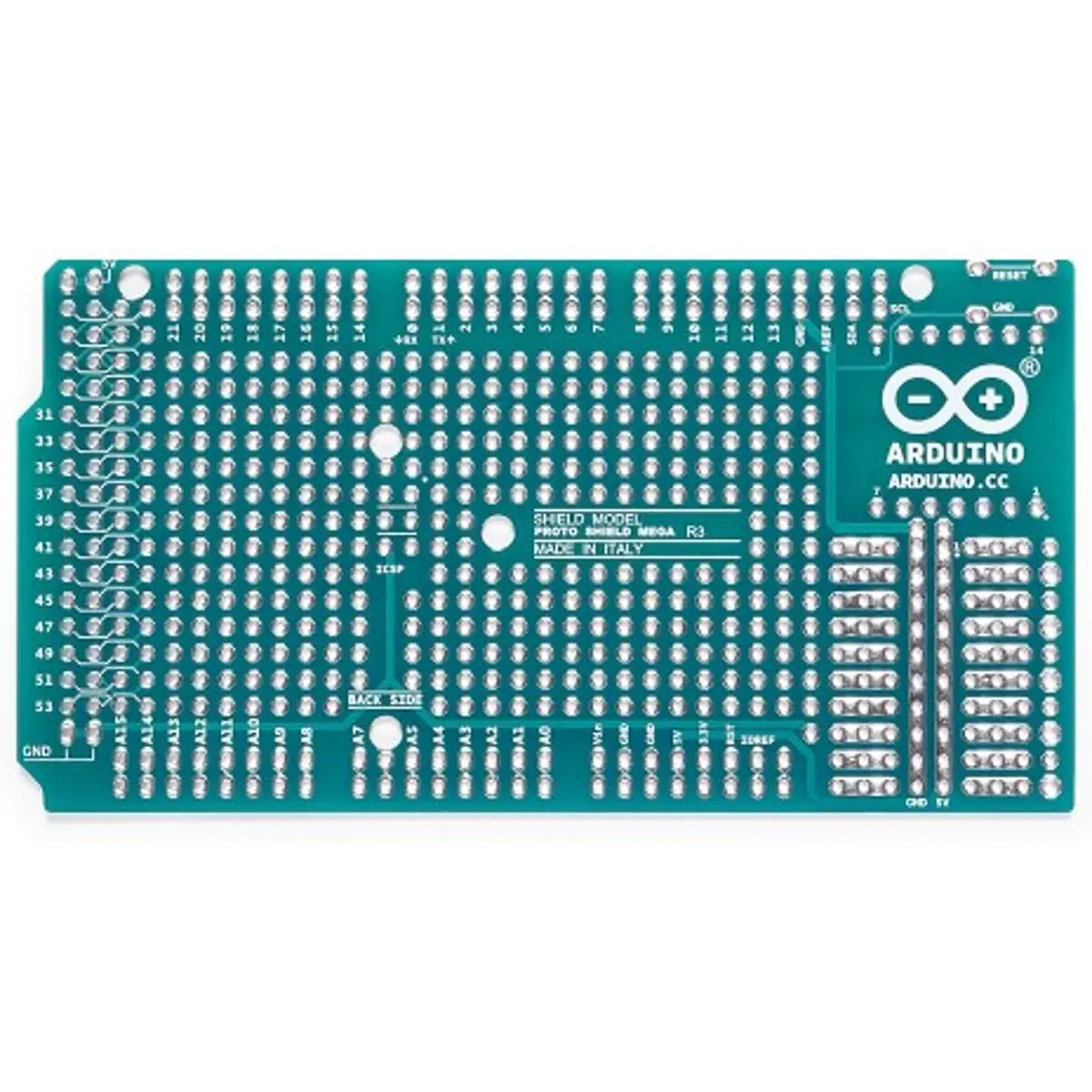 Tem ligações extra para todos os pinos de E/S MEGA Arduino, e tem espaço para montar circuitos integrados de montagem através de orifícios e de superfície. É uma forma conveniente de tornar o seu circuito Arduino personalizado num único módulo.