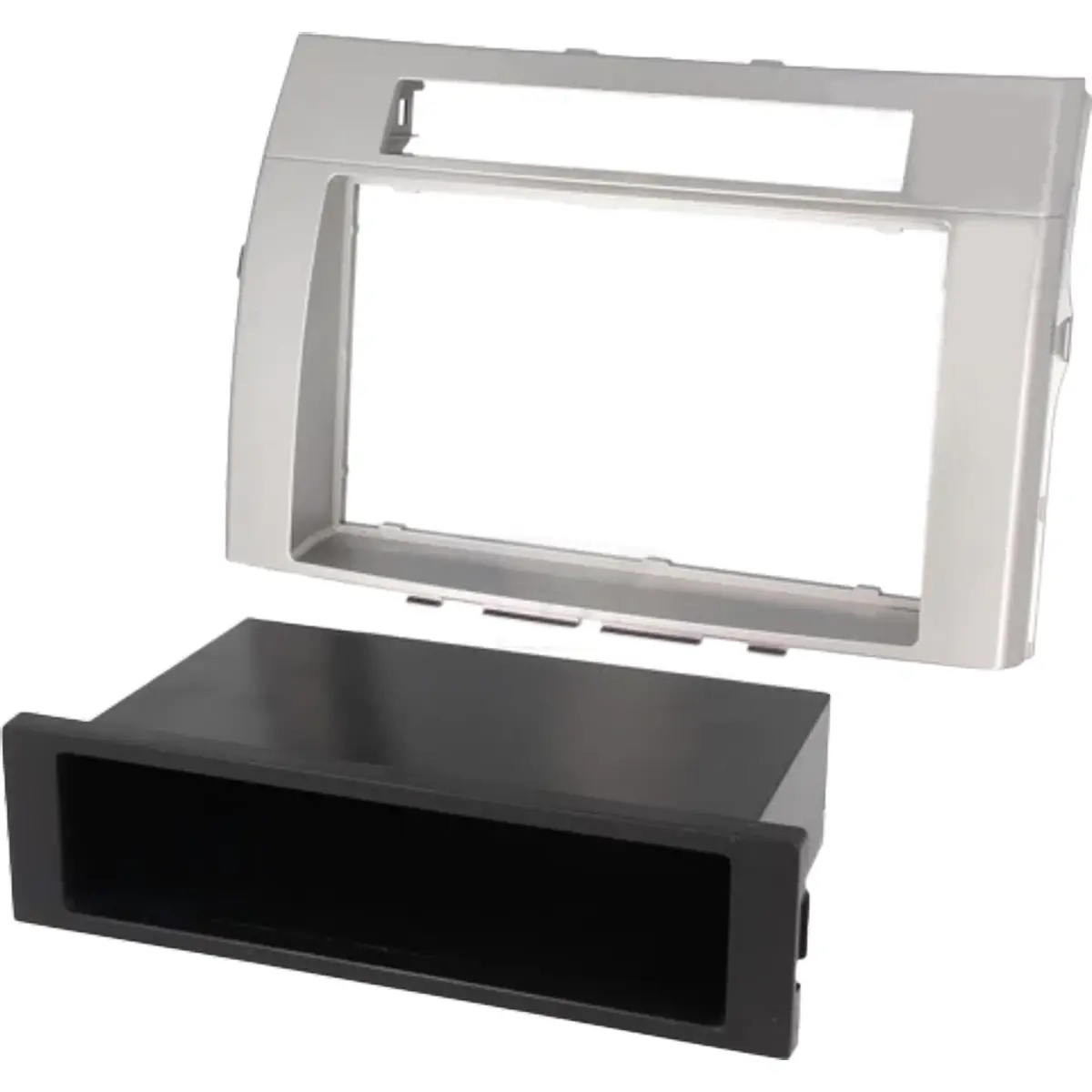 Moldura de montagem para rádio automóvel 1 DIN / 2 DIN com acabamento prateado, compatível com aberturas de 102x182 mm e aro de encaixe 112x189 mm. Compatível com Toyota Corolla Verso 2005-2009, facilita a instalação no tablier mantendo um aspecto limpo. Ideal para rádios de 1 ou 2 DIN, oferece encaixe estável e uma transição suave entre o rádio e o painel, com acabamento uniforme.