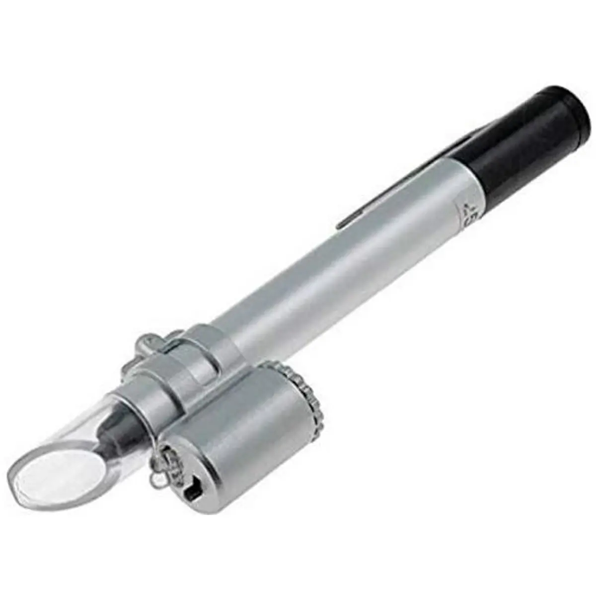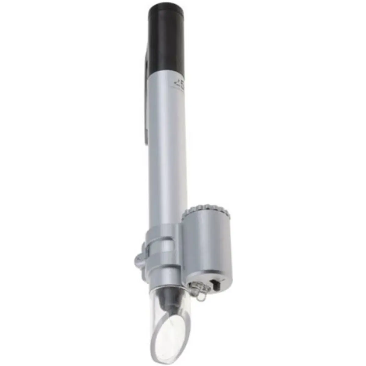 Microscópio de mão com LED para observação, oferecendo 50x de aumento através de uma lente Ø12mm. Possui foco ajustável para clarificar detalhes, e alimentação por 3 baterias LR927. Compacto e leve (25 g) com dimensões de Ø12x125mm, ideal para trabalhos de campo, aulas e tarefas de precisão onde a mobilidade importa, sem necessidade de instrumentos grandes.
