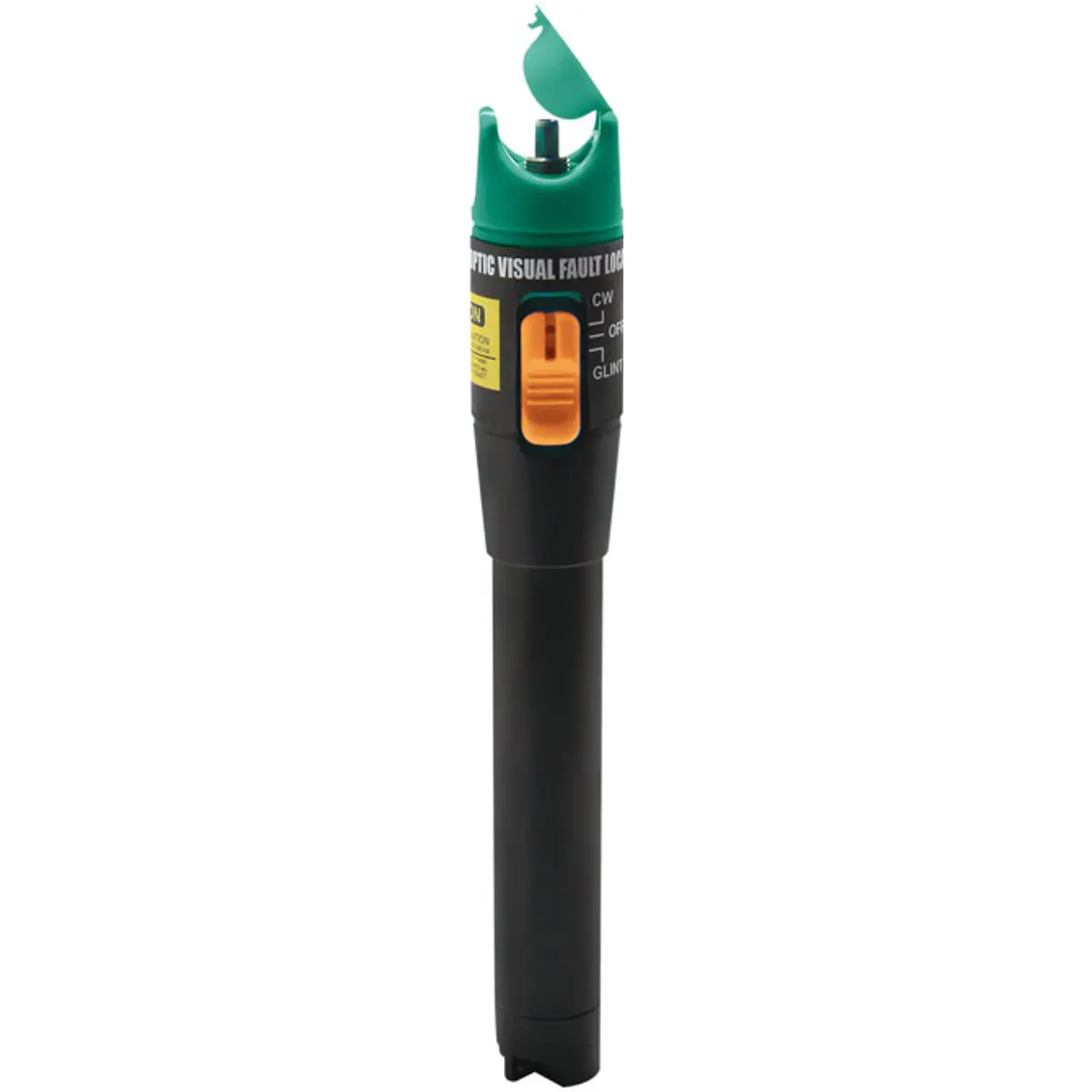 Teste de falhas de fibra óptica compacto, alimentado por duas pilhas alcalinas AA (não incluídas). Possui laser de classe IIIB com potência de 10 mW e comprimento de 175 mm, compatível com conectores FC, ST e SC universais de 2,5 mm. Permite identificar pontos de interrupção ou más ligações, facilitando inspeções, diagnóstico e manutenção de redes de fibra óptica em ambientes industriais ou de laboratório.